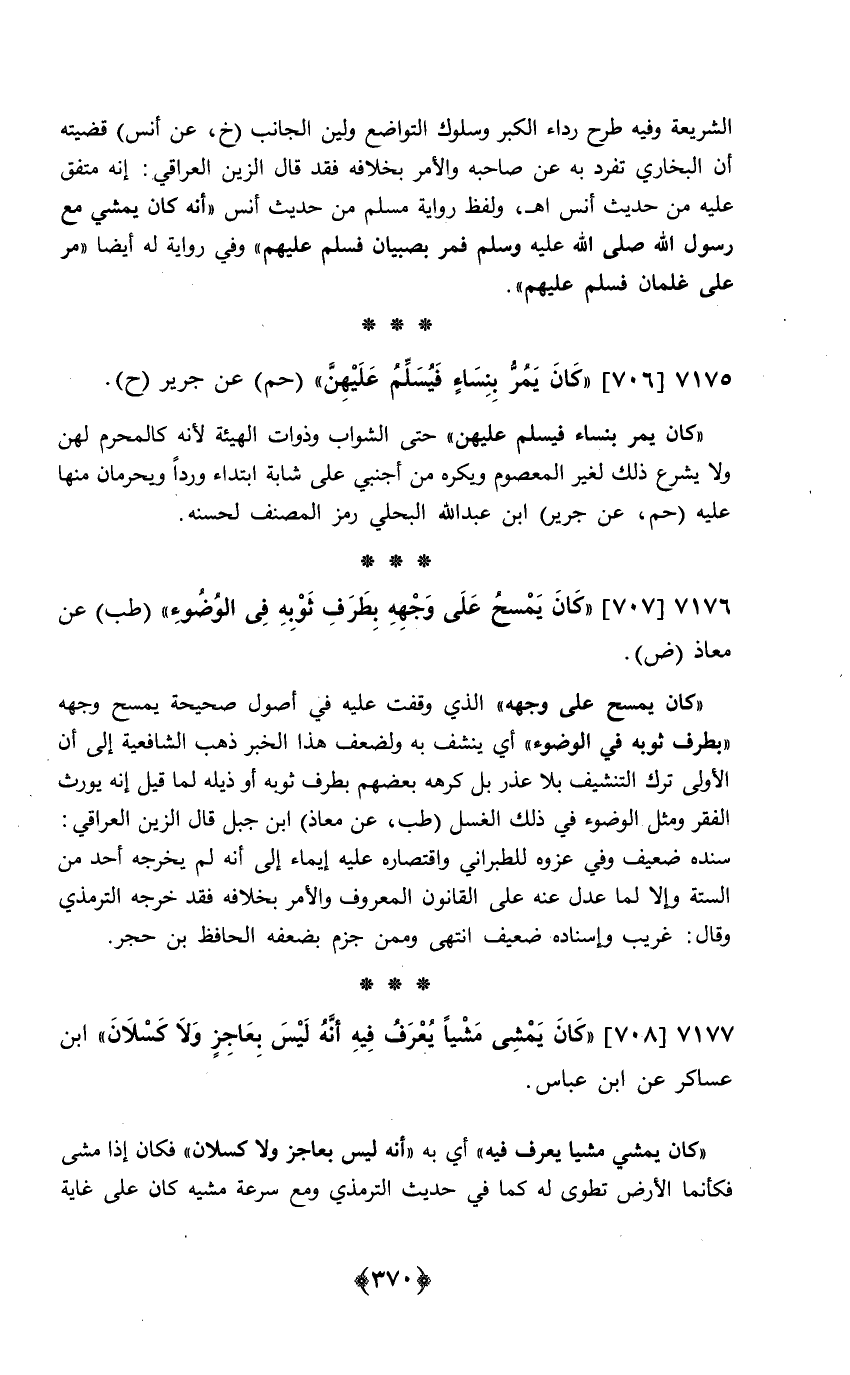 كَانَ يمر بنساء فَيسلم عَلَيْهِنَّ حَتَّى الشواب وَذَوَات الْهَيْئَة لِأَنَّهُ كالمحرم لَهُنَّ وَلَا يشرع ذَلِك لغير الْمَعْصُوم وَيكرهُ من أَجْنَبِي على شَابة ابْتِدَاء وردا ويحرمان مِنْهَا عَلَيْهِ حم عَن جرير ابْن عبد الله البحلي رمز المُصَنّف لحسنه