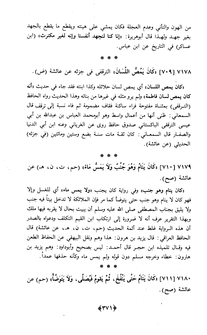 710 - (كَانَ ينَام وَهُوَ جنب وَلَا يمس مَاء) حم ت ن هـ عَن عَائِشَة // صَحَّ //