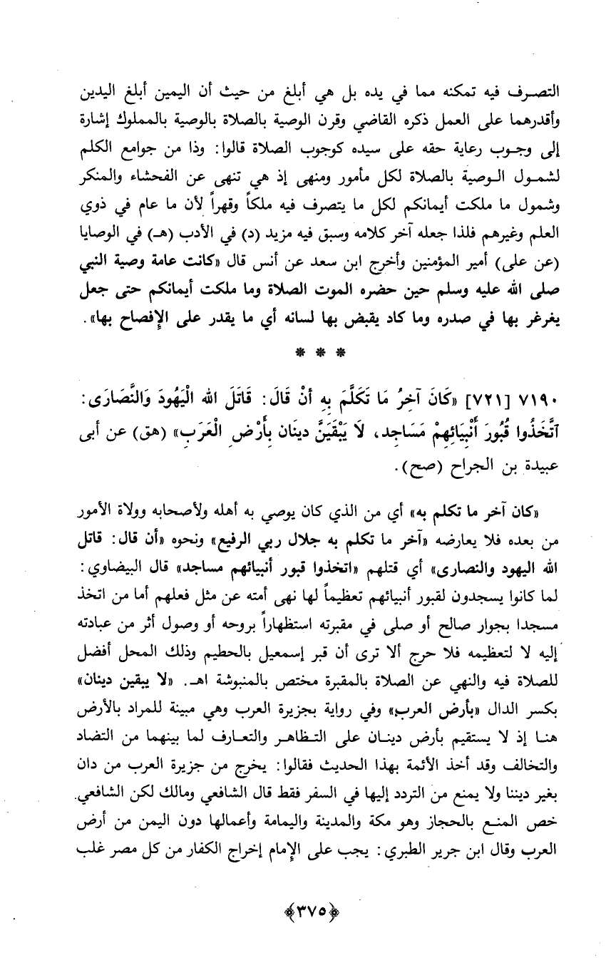 كَانَ آخر مَا تكلم بِهِ أَي من الَّذِي كَانَ يُوصي بِهِ أَهله ولأصحابه وولاة الْأُمُور من بعده فَلَا يُعَارضهُ آخر مَا تكلم بِهِ جلال رَبِّي الرفيع وَنَحْوه أَن قَالَ قَاتل الله الْيَهُود وَالنَّصَارَى أَي قَتلهمْ اتَّخذُوا قُبُور أَنْبِيَائهمْ مَسَاجِد قَالَ الْبَيْضَاوِيّ لما كَانُوا يَسْجُدُونَ لقبور أَنْبِيَائهمْ تَعْظِيمًا لَهَا نهى أمته عَن مثل فعلهم أما من اتخذ مَسْجِدا بجوار صَالح أَو صلى فِي مقبرته استظهارا بِرُوحِهِ أَو وُصُول أثر من عِبَادَته إِلَيْهِ لَا لتعظيمه فَلَا حرج أَلا ترى أَن قبر إِسْمَعِيل بِالْحَطِيمِ وَذَلِكَ الْمحل أفضل للصَّلَاة فِيهِ وَالنَّهْي عَن الصَّلَاة بالمقبرة مُخْتَصّ بالمنبوشة اه لَا يبْقين دينان بِكَسْر الدَّال بِأَرْض الْعَرَب وَفِي رِوَايَة بِجَزِيرَة الْعَرَب وَهِي مَبْنِيَّة للمراد بِالْأَرْضِ هُنَا إِذْ لَا يَسْتَقِيم بِأَرْض دينان على التظاهر والتعارف لما بَينهم من التضاد والتخالف وَقد أَخذ الْأَئِمَّة بِهَذَا الحَدِيث فَقَالُوا يخرج من جَزِيرَة الْعَرَب من دَان بِغَيْر ديننَا وَلَا يمْنَع من التَّرَدُّد إِلَيْهَا فِي السّفر فَقَط قَالَ الشَّافِعِي وَمَالك لَكِن الشَّافِعِي خص الْمَنْع بالحجاز وَهُوَ مَكَّة وَالْمَدينَة واليمامة وأعمالها دون الْيمن من أَرض الْعَرَب وَقَالَ ابْن جرير الطَّبَرِيّ يجب على الإِمَام إِخْرَاج الْكفَّار من كل مصر غلب