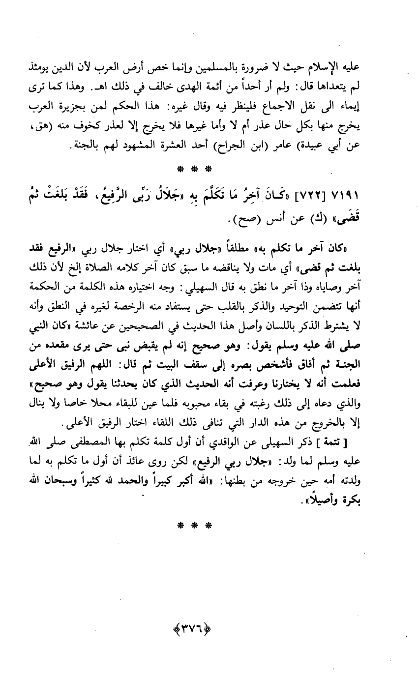 كَانَ آخر مَا تكلم بِهِ مُطلقًا جلال رَبِّي أَي اخْتَار جلال رَبِّي الرفيع فقد بلغت ثمَّ قضى أَي مَاتَ وَلَا يناقضه مَا سبق كَانَ آخر كَلَامه الصَّلَاة إِلَخ لِأَن ذَلِك آخر وَصَايَاهُ وَذَا آخر مَا نطق بِهِ قَالَ السُّهيْلي وَجه اخْتِيَاره هَذِه الْكَلِمَة من الْحِكْمَة أَنَّهَا تَتَضَمَّن التَّوْحِيد وَالذكر بِالْقَلْبِ حَتَّى يُسْتَفَاد مِنْهُ الرُّخْصَة لغيره فِي النُّطْق وَأَنه لَا يشْتَرط الذّكر بِاللِّسَانِ وأصل هَذَا الحَدِيث فِي الصَّحِيحَيْنِ عَن عَائِشَة كَانَ النَّبِي صلى الله عَلَيْهِ وَسلم يَقُول وَهُوَ صَحِيح إِنَّه لم يقبض نَبِي حَتَّى يرى مَقْعَده من الْجنَّة ثمَّ أَفَاق فأشخص بَصَره إِلَى سقف الْبَيْت ثمَّ قَالَ اللَّهُمَّ الرفيق الْأَعْلَى فَعلمت أَنه لَا يختارنا وَعرفت أَنه الحَدِيث الَّذِي كَانَ يحدثنا يَقُول وَهُوَ صَحِيح وَالَّذِي دَعَاهُ إِلَى ذَلِك رغبته فِي بَقَاء محبوبه فَلَمَّا عين للبقاء محلا خَاصّا وَلَا ينَال إِلَّا بِالْخرُوجِ من هَذِه الدَّار الَّتِي تنَافِي ذَلِك اللِّقَاء اخْتَار الرفيق الْأَعْلَى