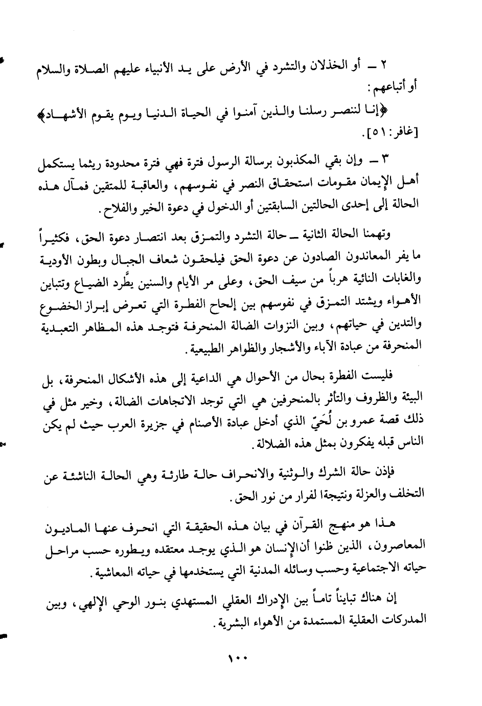 وهذه قضية بارزة جدًا يلمسها المتتبع لهدايات القرآن الكريم عند عرض قضايا الألوهية وهذا المنهج متسق تمامًا مع المنهج القرآني في تقرير الحقائق وتشريع الشرائع والأحكام، فكل قضية تعتمد على رصيد الفطرة عند الإنسان يأتي التذكير بها عامًا وإجمالًا، أما القضايا التكليفية التي تثار ليتوصل إليها الإنسان بعقله أو يأتي الوحي ليقرر الالتزام بها ولا تشكل الفطرة أحد مقوماتها ودوافعها، فإن القرآن يكثر من الاستدلال عليها وتوجه الأنظار للحكم الربانية في تقريرها، وكثيرًا ما تذكر دوافع تشريعاتها ونتائج الالتزام بها. وفي القرآن الكريم قضايا كثيرة من هذا القبيل، فمثلًا من الأمور المقررة في الشريعة أن السعي في الأرض وكسب الرزق واتباع الأسباب التي جعلها الله سبحانه وتعالى بين الخلائق للحصول على لقمة العيش، هذا السعي أمر مطلوب شرعًا ومن كان صاحب عيال ولديه القدرة على السعي والكسب يؤاخذ إن ترك السعي وضيع العيال. ولكننا لا نجد أن القرآن الكريم قد تعرض لهذا الجانب -طلب السعي لتحصيل الرزق والمعاش- إلا لمامًا، وفي أحاديث عرضية فمثلًا نجد قوله تعالى: {فَامْشُوا فِي مَنَاكِبِهَا وَكُلُوا مِنْ رِزْقِهِ وَإِلَيْهِ النُّشُورُ} [الملك: 15] جاء في سياق الحديث عن نعم الله على العباد الذي خلق لهم وسائل المعيشة وجعل الأرض ذلولة لهم لا تستعصي عليهم عند السعي عليها أو إقامة المصالح في جنباتها. فكل ذلك يقتضي شكر المنعم المتفضل عليهم بذلك وجاء قوله تعالى: {فَإِذَا قُضِيَتِ الصَّلاةُ فَانْتَشِرُوا فِي الْأَرْضِ وَابْتَغُوا مِنْ فَضْلِ اللَّهِ وَاذْكُرُوا اللَّهَ كَثِيرًا لَعَلَّكُمْ تُفْلِحُونَ} [الجمعة: 10] ، جاء بعد النهي عن البيع والكسب عند النداء لصلاة الجمعة بعد قوله تعالى