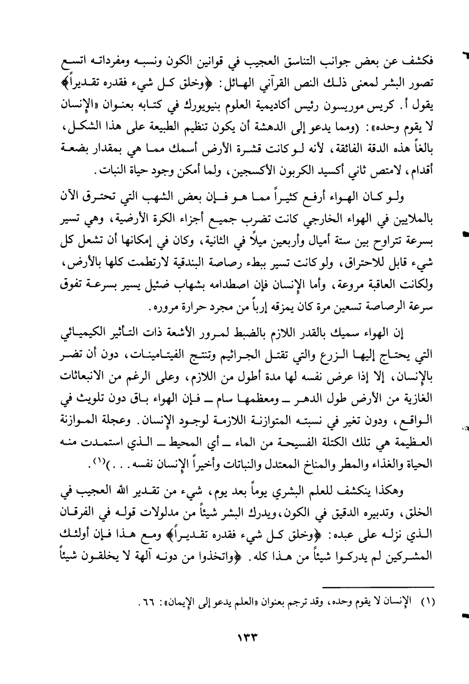 وخزائن الله سبحانه وتعالى ملأى بالأسرر لا ينقصها عطاء الليل والنهار {وَإِنْ مِنْ شَيْءٍ إِلَّا عِنْدَنَا خَزَائِنُهُ وَمَا نُنَزِّلُهُ إِلَّا بِقَدَرٍ مَعْلُومٍ} . فهل يوجد عاقل يحترم عقله ويقول إن الكون وجد صدفة بهذا النظام وتشكلت نواميسه وسننه اتفاقًا؟ قال بعضهم عن القول إن نظام الكون وجد صدفة: "إن القول بأن الحياة وجدت نتيجة "حادث اتفاقي" شبيه في مغزاه بأن نتوقع إعداد معجم ضخم نتيجة انفجار صدفي يقع في مطبعة2.