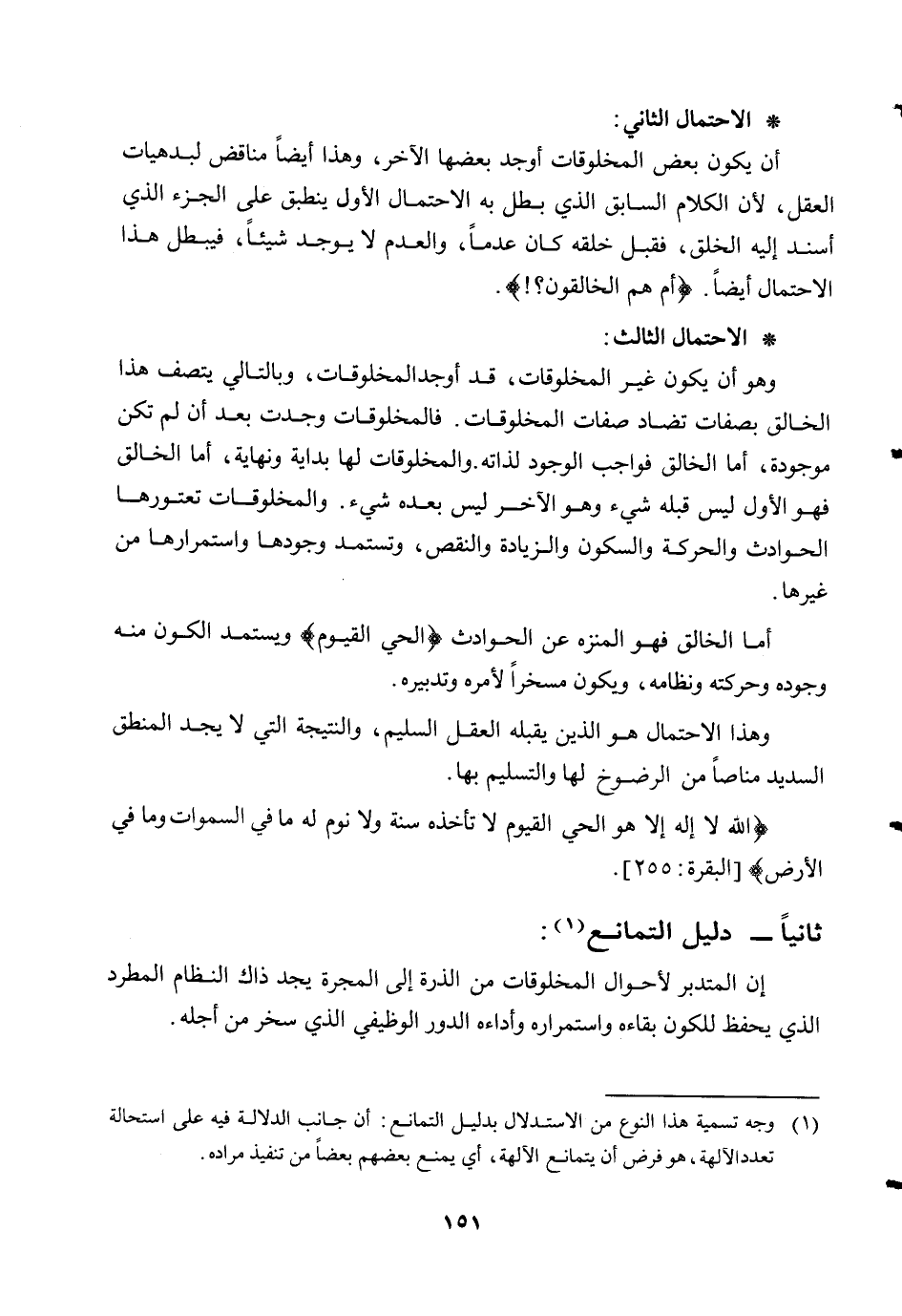 ووجه انتظام هذا الاستدلال أنه لو تعددت الآلهة للزم أن يكون كل إله متصفًا بصفات الإلهية المعروفة آثارها، وهي الإرادة المطلقة والقدرة التامة على التصرف.