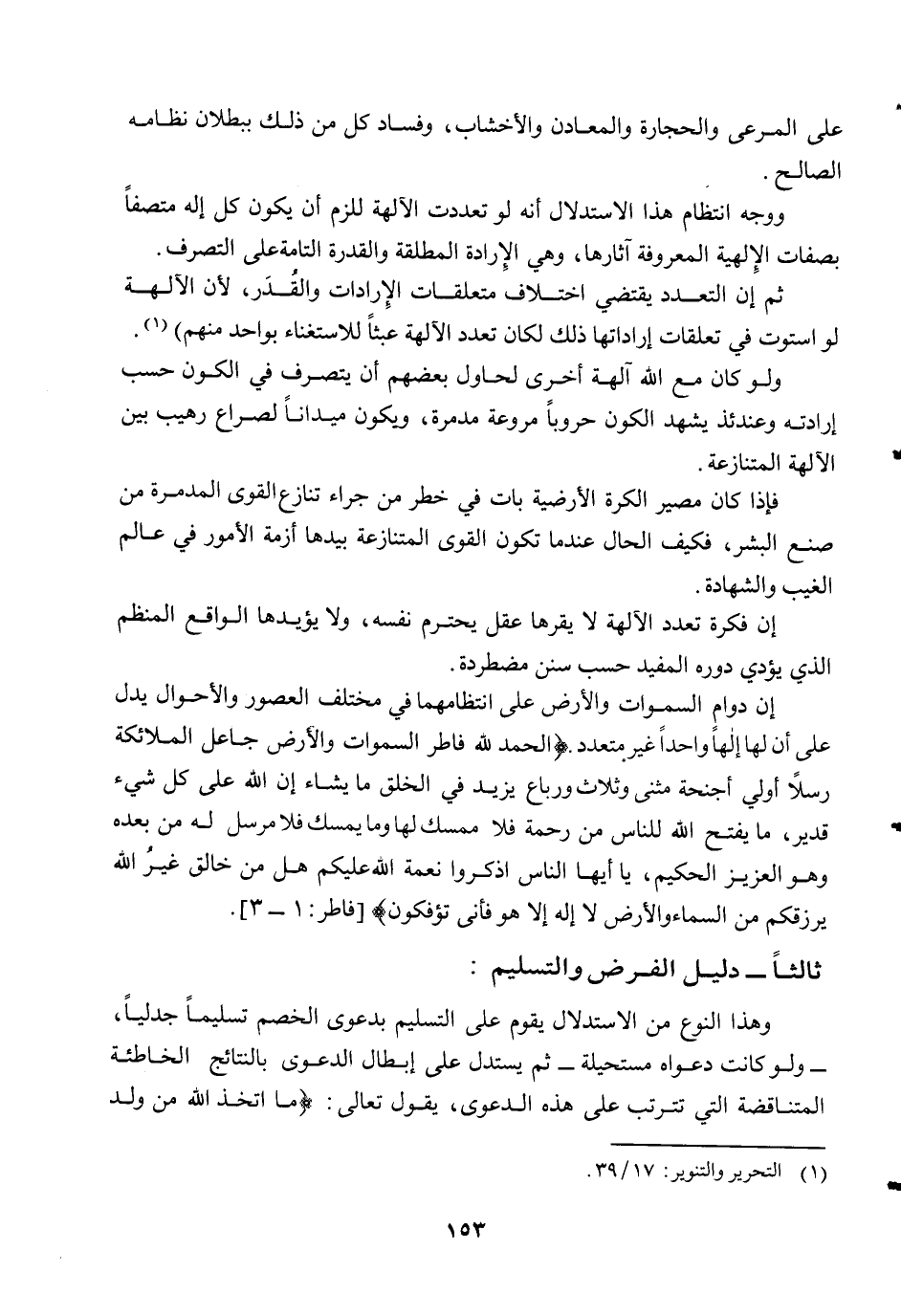 وحمد نفسه على عدم الشريك المتضمن تفرده بالربوبية والإلهية وتوحده بصفات الكمال التي لا يوصف بها غيره فيكون شريكًا له، لو عدمها لكان كل وجود أكمل منه لأن الموجود أكمل من المعدوم، ولهذا لا يحمد نفسه سبحانه بعدم إلا إذا كان متضمنًا ثبوت كمال.
