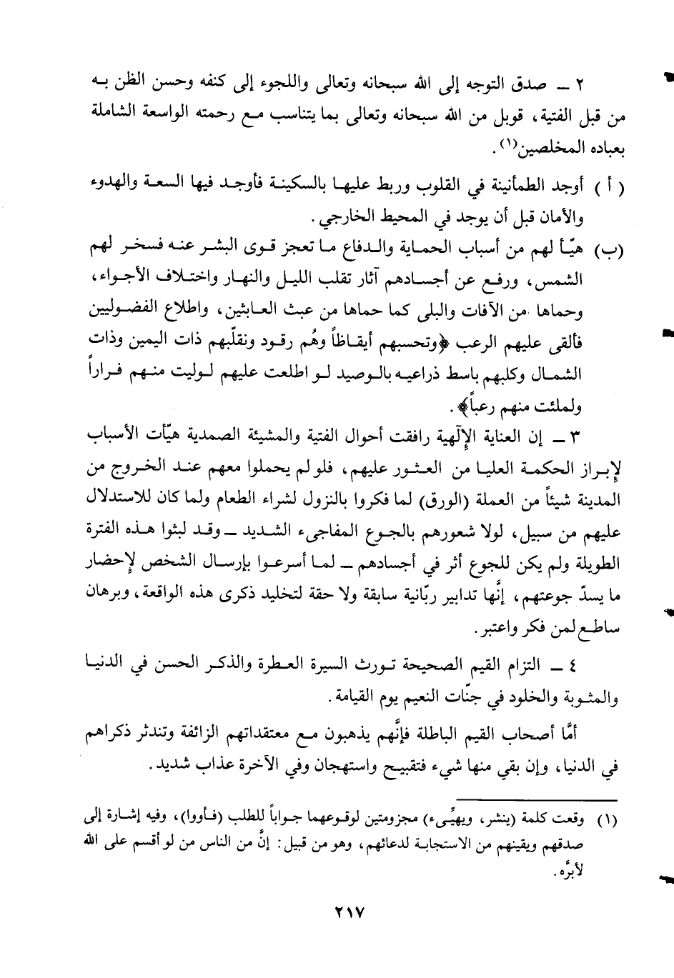 {وَاصْبِرْ نَفْسَكَ مَعَ الَّذِينَ يَدْعُونَ رَبَّهُمْ بِالْغَدَاةِ وَالْعَشِيِّ يُرِيدُونَ وَجْهَهُ وَلا تَعْدُ عَيْنَاكَ عَنْهُمْ تُرِيدُ زِينَةَ الْحَيَاةِ الدُّنْيَا وَلا تُطِعْ مَنْ أَغْفَلْنَا قَلْبَهُ عَنْ ذِكْرِنَا وَاتَّبَعَ هَوَاهُ وَكَانَ أَمْرُهُ فُرُطًا، وَقُلِ الْحَقُّ مِنْ رَبِّكُمْ فَمَنْ شَاءَ فَلْيُؤْمِنْ وَمَنْ شَاءَ فَلْيَكْفُرْ إِنَّا أَعْتَدْنَا لِلظَّالِمِينَ نَارًا أَحَاطَ بِهِمْ سُرَادِقُهَا وَإِنْ يَسْتَغِيثُوا يُغَاثُوا بِمَاءٍ كَالْمُهْلِ يَشْوِي الْوُجُوهَ بِئْسَ الشَّرَابُ وَسَاءَتْ مُرْتَفَقًا، إِنَّ الَّذِينَ آمَنُوا وَعَمِلُوا الصَّالِحَاتِ إِنَّا لا نُضِيعُ أَجْرَ مَنْ أَحْسَنَ عَمَلًا، أُولَئِكَ لَهُمْ جَنَّاتُ عَدْنٍ تَجْرِي مِنْ تَحْتِهِمُ الْأَنْهَارُ يُحَلَّوْنَ فِيهَا مِنْ أَسَاوِرَ مِنْ ذَهَبٍ وَيَلْبَسُونَ ثِيَابًا خُضْرًا مِنْ سُنْدُسٍ وَإِسْتَبْرَقٍ مُتَّكِئِينَ فِيهَا عَلَى الْأَرَائِكِ نِعْمَ الثَّوَابُ وَحَسُنَتْ مُرْتَفَقًا، وَاضْرِبْ لَهُمْ مَثَلًا رَجُلَيْنِ جَعَلْنَا لِأَحَدِهِمَا جَنَّتَيْنِ مِنْ أَعْنَابٍ وَحَفَفْنَاهُمَا بِنَخْلٍ وَجَعَلْنَا بَيْنَهُمَا زَرْعًا، كِلْتَا الْجَنَّتَيْنِ آتَتْ أُكُلَهَا وَلَمْ تَظْلِمْ مِنْهُ شَيْئًا وَفَجَّرْنَا خِلالَهُمَا نَهَرًا، وَكَانَ لَهُ ثَمَرٌ فَقَالَ لِصَاحِبِهِ وَهُوَ يُحَاوِرُهُ أَنَا أَكْثَرُ مِنْكَ مَالًا وَأَعَزُّ نَفَرًا، وَدَخَلَ جَنَّتَهُ وَهُوَ ظَالِمٌ لِنَفْسِهِ قَالَ مَا أَظُنُّ أَنْ تَبِيدَ هَذِهِ أَبَدًا، وَمَا أَظُنُّ السَّاعَةَ قَائِمَةً وَلَئِنْ رُدِدْتُ إِلَى رَبِّي لَأَجِدَنَّ خَيْرًا مِنْهَا مُنْقَلَبًا، قَالَ لَهُ صَاحِبُهُ وَهُوَ يُحَاوِرُهُ أَكَفَرْتَ بِالَّذِي خَلَقَكَ مِنْ تُرَابٍ ثُمَّ مِنْ نُطْفَةٍ ثُمَّ سَوَّاكَ رَجُلًا، لَكِنَّا هُوَ اللَّهُ رَبِّي وَلا أُشْرِكُ بِرَبِّي أَحَدًا، وَلَوْلا إِذْ دَخَلْتَ جَنَّتَكَ قُلْتَ مَا شَاءَ اللَّهُ لا قُوَّةَ إِلَّا بِاللَّهِ إِنْ تَرَنِ أَنَا أَقَلَّ مِنْكَ مَالًا وَوَلَدًا، فَعَسَى رَبِّي أَنْ يُؤْتِيَنِ خَيْرًا مِنْ جَنَّتِكَ وَيُرْسِلَ عَلَيْهَا حُسْبَانًا مِنَ السَّمَاءِ فَتُصْبِحَ صَعِيدًا زَلَقًا، أَوْ يُصْبِحَ مَاؤُهَا غَوْرًا فَلَنْ تَسْتَطِيعَ لَهُ طَلَبًا، وَأُحِيطَ بِثَمَرِهِ فَأَصْبَحَ يُقَلِّبُ كَفَّيْهِ عَلَى مَا أَنْفَقَ فِيهَا وَهِيَ خَاوِيَةٌ عَلَى عُرُوشِهَا وَيَقُولُ يَا لَيْتَنِي لَمْ أُشْرِكْ بِرَبِّي أَحَدًا، وَلَمْ تَكُنْ لَهُ فِئَةٌ يَنْصُرُونَهُ مِنْ دُونِ اللَّهِ وَمَا كَانَ مُنْتَصِرًا، هُنَالِكَ الْوَلايَةُ لِلَّهِ الْحَقِّ هُوَ خَيْرٌ ثَوَابًا وَخَيْرٌ عُقْبًا، وَاضْرِبْ لَهُمْ مَثَلَ الْحَيَاةِ الدُّنْيَا كَمَاءٍ أَنْزَلْنَاهُ مِنَ السَّمَاءِ فَاخْتَلَطَ بِهِ نَبَاتُ الْأَرْضِ فَأَصْبَحَ هَشِيمًا تَذْرُوهُ الرِّيَاحُ وَكَانَ اللَّهُ عَلَى كُلِّ شَيْءٍ مُقْتَدِرًا، الْمَالُ وَالْبَنُونَ زِينَةُ الْحَيَاةِ الدُّنْيَا وَالْبَاقِيَاتُ الصَّالِحَاتُ خَيْرٌ عِنْدَ رَبِّكَ ثَوَابًا وَخَيْرٌ أَمَلًا} [الآيات منِ: 28-46] .