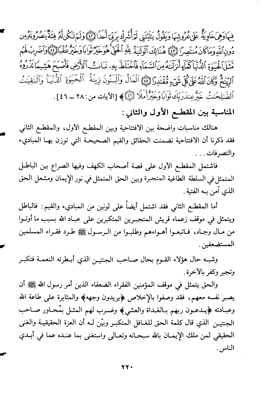 3- ختم المقطع الأول بقوله تعالى: {وَاتْلُ مَا أُوحِيَ إِلَيْكَ مِنْ كِتَابِ رَبِّكَ لا مُبَدِّلَ لِكَلِمَاتِهِ وَلَنْ تَجِدَ مِنْ دُونِهِ مُلْتَحَدًا} .