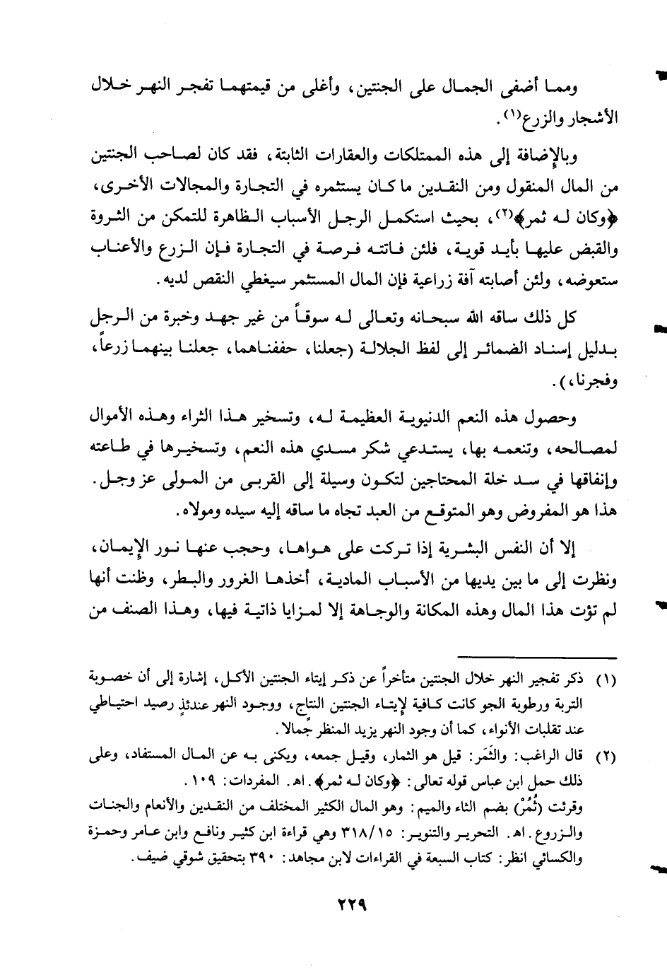فعلى ضوء هذه الحقائق كان عليه أن يدخل جنته ويحمد الله الذي أنعم عليه بها من غير حول منه ولا قوة، ولو عرف حق الله عليه فيها فأنفق منها في وجوه الخير والبر، لكانت له مزية على غيره، ولعرف الناس فضله ومكانته، "إن فقراء المهاجرين أتوا رسول الله صلى الله عليه وسلم فقالوا: ذهب أهل الدثور بالدرجات العلى والنعيم المقيم فقال: "وما ذاك؟ " قالوا: يصلون كما نصلي ويصومون كما نصوم ويتصدقون ولا نتصدق ويعتقون ولا نعتق، فقال رسول الله صلى الله عليه وسلم: "أفلا أعلمكم شيئًا تدركون به من سبقكم وتسبقون به من بعدكم، ولا يكون أحدًا أفضل منكم إلا من صنع مثل ما صنعتم؟ " قالوا: بلى يا رسول الله، قال: "تسبحون وتكبرون وتحمدون دبر كل صلاة ثلاثًا وثلاثين مرة"، قال أبو صالح: فرجع فقراء المهاجرين إلى رسول الله صلى الله عليه وسلم فقالوا: سمع إخواننا أهل الأموال بما فعلنا ففعلوا مثله، فقال رسول الله صلى الله عليه وسلم: