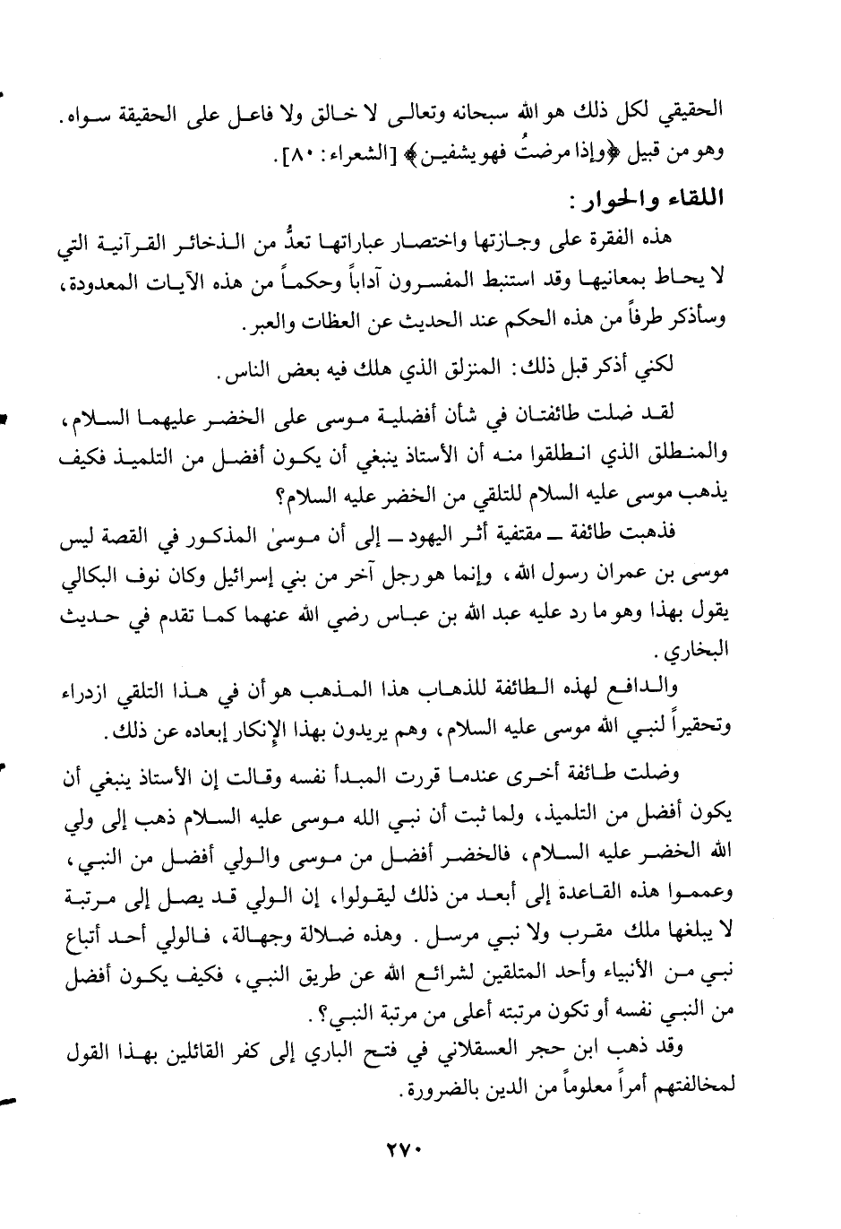 ولعل سياق النص الكريم يدل بإشاراته وظلاله إلى ما ورد في الحديث الصحيح من سبب خروج موسى عليه السلام، وعتب الله سبحانه وتعالى له. ليلقى من الرجل الصالح لونًا من ألوان الاستعلاء بالعلم اللدني. ولكن هذا. الاستعلاء لا يخرجه من إعادة الفضل والنعمة إلى مسديه كما ورد في صحبح البخاري: "فسلم عليه موسى فكشف عن وجهه وقال: هل بأرضك من سلام، من أنت؟ قال: أنا موسى، قال: موسى بني إسرائيل؟ قال: نعم، قال: فما شأنك؟ قال: جئت لتعلمني مما علمت رشدًا، قال: أما يكفيك أن التوراة بيدك؛ وأن الوحي يأتيك؟ يا موسى إن لي علمًا لا ينبغي لك أن تعلمه، وإن لك علمًا لا ينبغي لي أن أعلمه ... فأخذ طائر بمنقاره من البحر، وقال: والله ما علمي وعلمك من جنب علم الله إلا كما أخذ هذا الطائر بمنقاره من البحر"2.