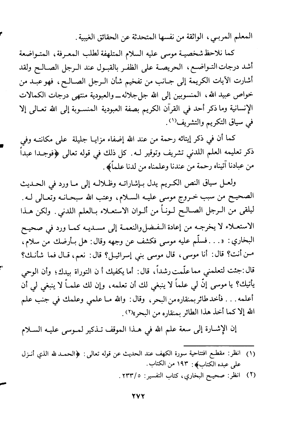 أما تعليم موسى فيكون على يد العبد الصالح "تعلمني"، وكأنه يقول إن الفرق بين علمك وعلمي كالفرق بين المعلمين، وهذا منتهى التقدير والاعتراف بالمنة، كما قيل: "من علمني حرفًا كنت له عبدًا" وقال شعبة: من أخذت منه أربعة أحاديث أقررت له بالعبودية حياتي.