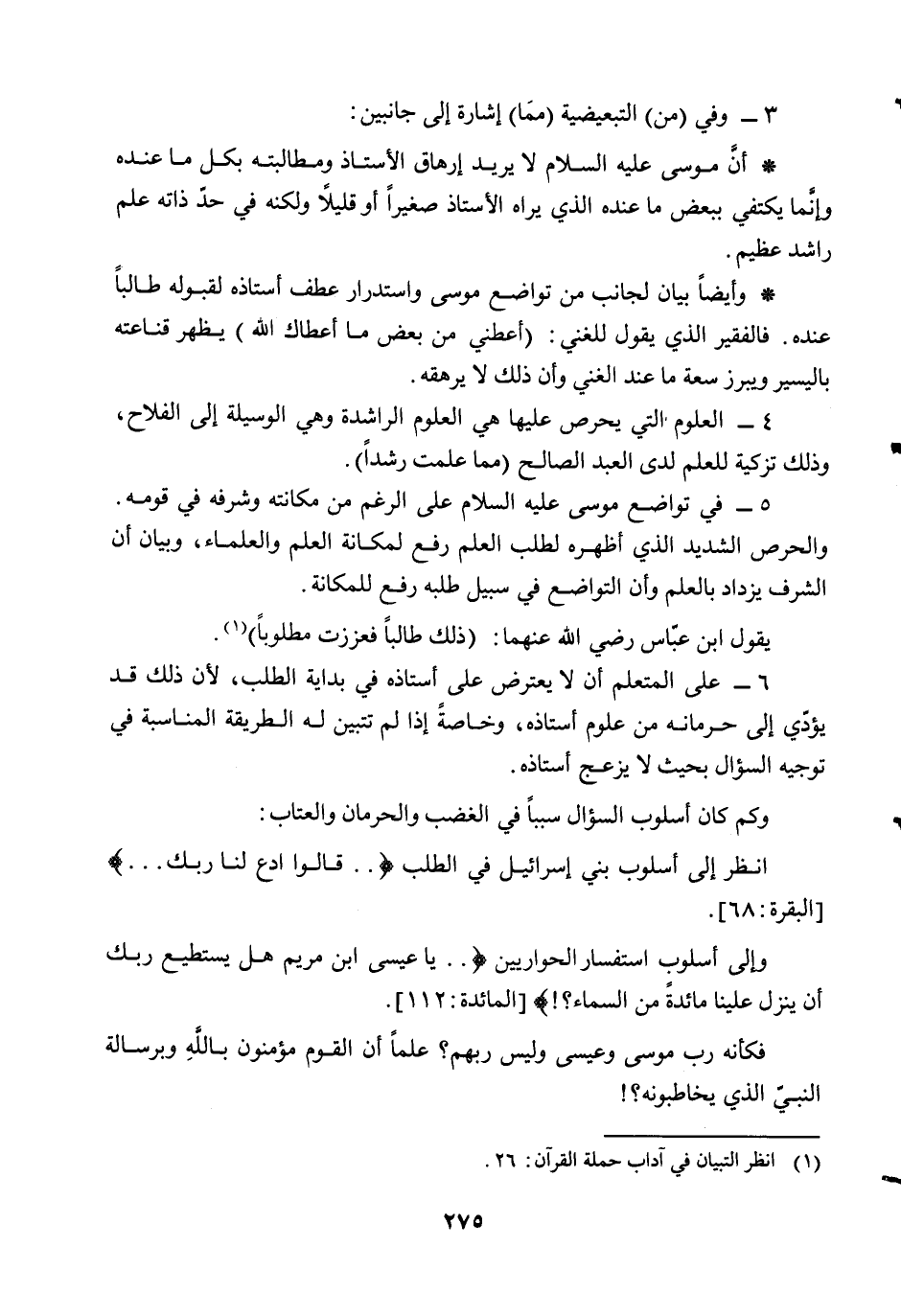 ولكن الرجل الصالح ينظر إلى المسألة من زاوية أخرى، بناء على الحكمة العليا والمصلحة الآجلة، وتطبيقًا للقاعدة الشرعية المتفق عليها بين العلماء الربانيين "يتحمل الضرر الأدنى لدفع الضرر الأقوى" فيذكر موسى عليه السلام {أَلَمْ أَقُلْ إِنَّكَ لَنْ تَسْتَطِيعَ مَعِيَ صَبْرًا} . وتهدأ نفس موسى عليه السلام ويذكر العهد الذي قطعه على نفسه بعدم الاعتراض والاستفسار، حتى يكون الخضر هو البادئ بالتوضيح والبيان، وتطمئن نفسه إلى أن صاحبه ليس كسائر الأصحاب، وإنما هو رجل رباني على جانب من العلم لا يعمله موسى.