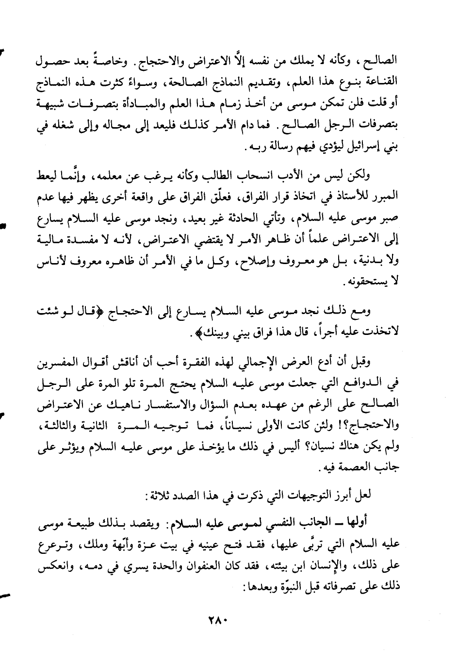 ومن هذا القبيل ما جرى لموسى عليه السلام، فقد قطع على نفسه العهد بأن لا يسأل -وبالأولى أن لا يعترض- حتى يكون الرجل الصالح هو البادئ بالشرح والبيان ولكنه عندما خرج إلى التجربة العملية، ورأى أمام عينه هذا التخريب والإفساد -حسب الظاهر- نسي وعده واستنكر.