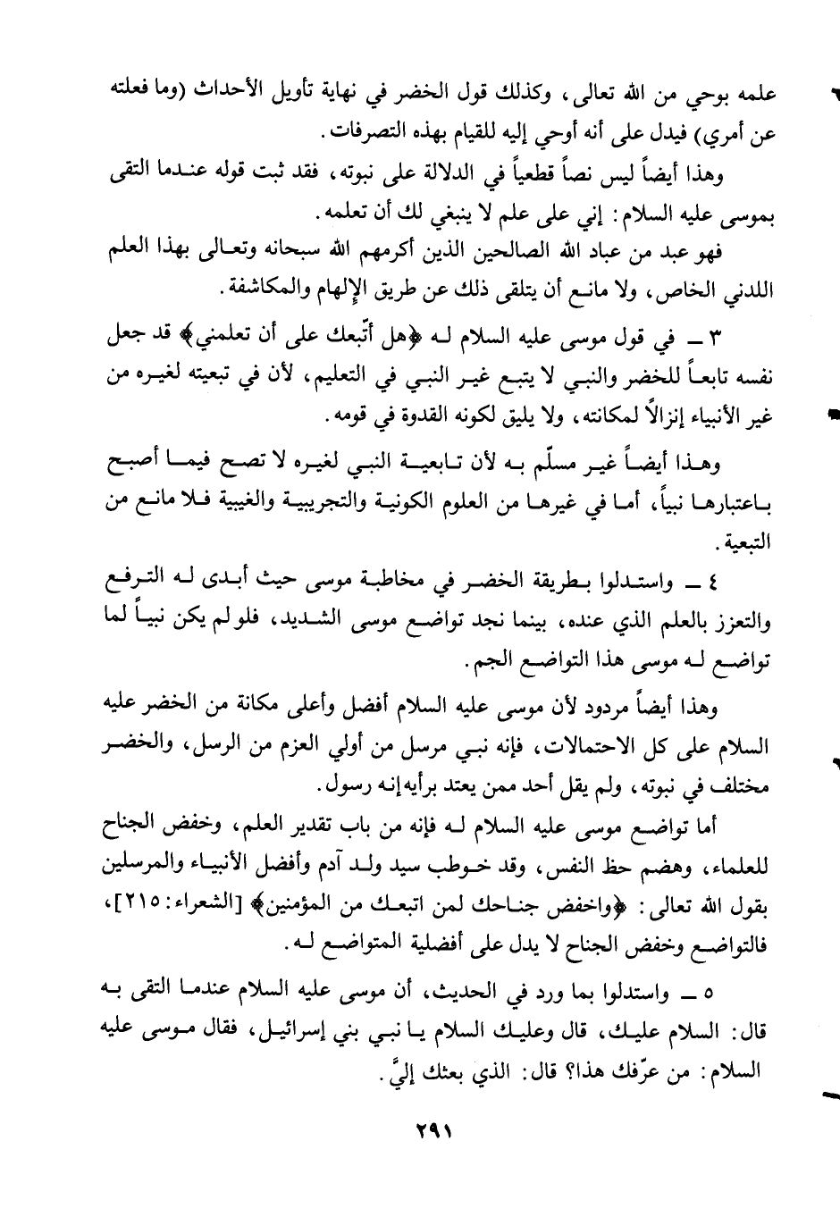 4- لو كان الخضر حيًا لآمن برسول الله صلى الله عليه وسلم ونصره وقاتل معه ولحضر الجمعة والجماعة، وقد قال رسول الله صلى الله عليه وسلم: "لو كان موسى حيًا لما وسعه إلا اتباعي" 3. وقد أخذ الله سبحانه وتعالى الميثاق على النبيين وأممهم أن يؤمنوا برسول الله وينصروه، إذا أدركوا زمن بعثته كما في قوله تعالى: {وَإِذْ أَخَذَ اللَّهُ مِيثَاقَ النَّبِيِّينَ لَمَا آتَيْتُكُمْ مِنْ كِتَابٍ وَحِكْمَةٍ ثُمَّ جَاءَكُمْ رَسُولٌ مُصَدِّقٌ لِمَا مَعَكُمْ لَتُؤْمِنُنَّ بِه