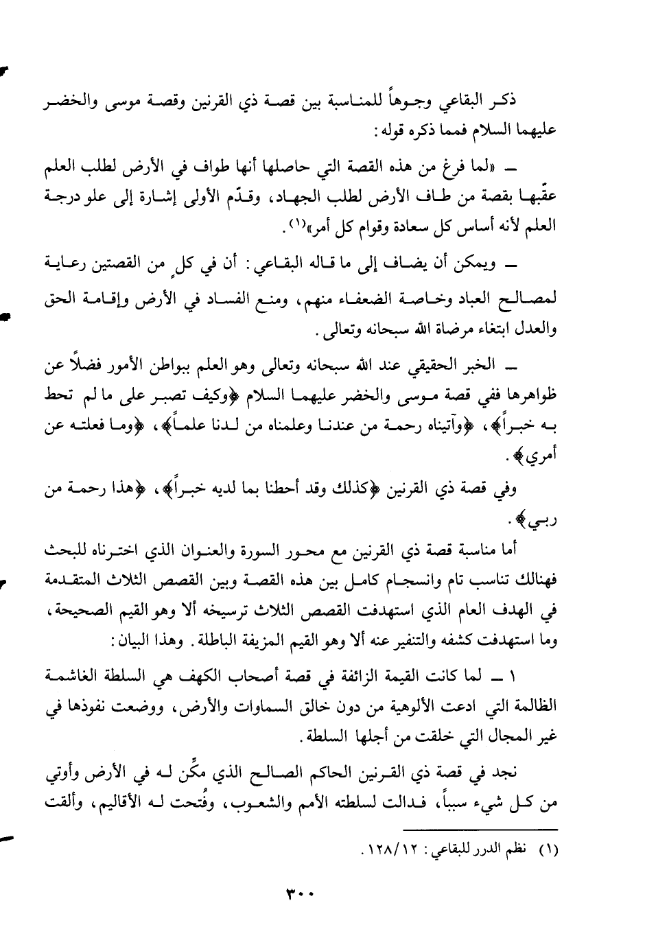 لقد جاءت قصة ذي القرنين في خاتمة القصص السابقة لتبرز القيم الصحيحة واقعًا متمثلًا في سيرة أحد عباد الله الصالحين، ولا تكون مظنة خيالات ومثل لا مجال لتطبيقها على هذه الأرض وفي الواقع البشري1. بالإضافة إلى أنها من
