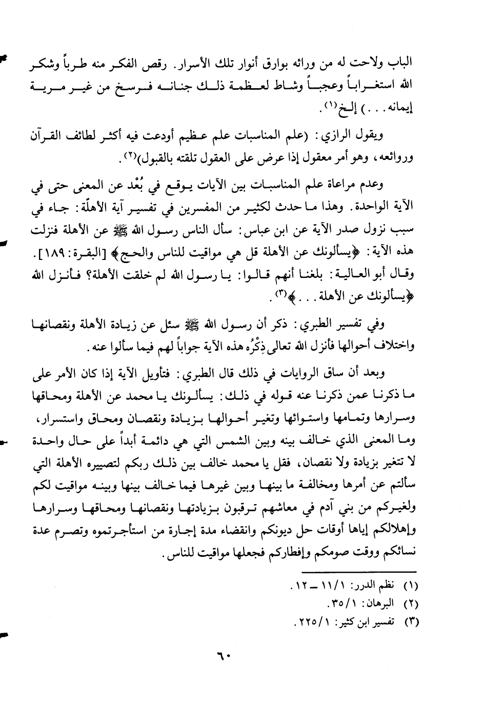 ونقل السيوطي في الإتقان قوله: "إن ربط آيات القرآن على ترتيب نزوله تكلف لا يليق، إذ إنه يشترط في حسن الكلام أن يقع في أمر متحد مرتبط أوله بآخره، فإن وقع على أسباب مختلفة لم يقع فيه ارتباط، ومن ربط ذلك فهو متكلف بما لا يقدر عليه إلا بربط ركيك، يصان عن مثله حسن الحديث فضلًا عن أحسنه، فإن القرآن نزل في نيف وعشرين سنة في أحكام مختلفة شرعت لأسباب مختلفة، وما كان كذلك لا يتأتى ربط بعضه ببعض"1.