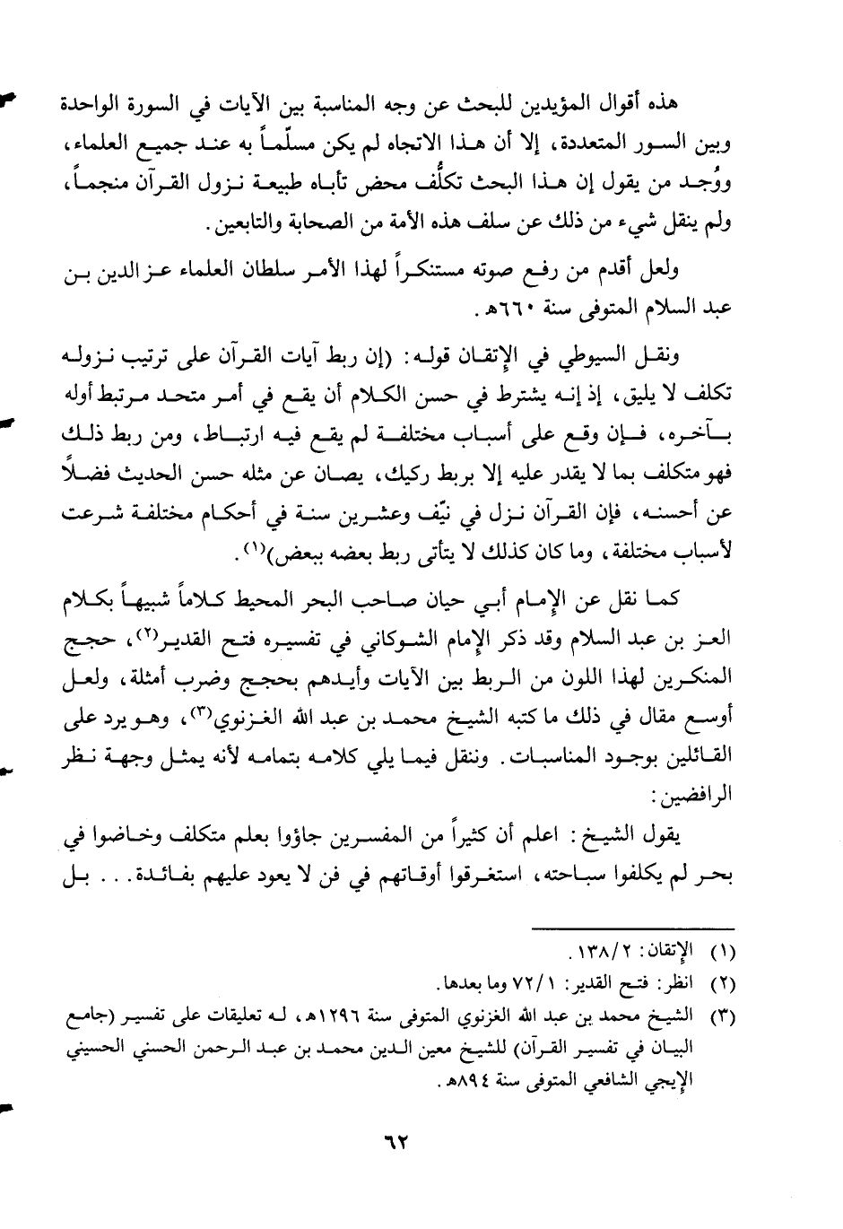 القرآن كان مرتبًا على هذا الترتيب الكائن في المصحف، فكيف وكل من له أدنى علم بالكتاب وأيسر حظ من معرفته يعلم علمًا يقينًا أنه لم يكن كذلك، ومن شك في هذا -وإن لم يكن مما يشك فيه أهل العلم- رجع إلى كلام أهل العلم العارفين بأسباب النزول، المطلعين على حوادث النبوة، فإنه يثلج صدره وينزل عنه الريب بالنظر في سورة من السور المتوسطة، فضلًا عن المطولة، فإنه لا محالة يجدها مشتملة على آيات نزلت في حوادث مختلفة وأوقات متباينة، لا مطابقة بين أسبابها، وما نزل فيها في الترتيب، بل يكفي المقصر أن يعلم أن أول ما نزل {اقْرَأْ بِاسْمِ رَبِّكَ الَّذِي خَلَقَ} وبعده {يَا أَيُّهَا الْمُدَّثِّر} ، {يَا أَيُّهَا الْمُزَّمِّلُ} ، وينظر أي موضع هذه الآيات والسور في ترتيب المصحف. وإذا كان الأمر هكذا، فأي معنى لطلب المناسبة بين آيات نعلم قطعًا أنه قد تقدم في ترتيب المصحف ما أنزل الله متأخرًا، أو تأخر ما أنزل الله متقدمًا؟! فإن هذا عمل لا يرجع إلى ترتيب نزول القرآن بل إلى ما وقع من الترتيب عند جمعه ممن تصدى لذلك من الصحابة، وما أقل نفع مثل هذا وأنزر ثمرته وأحقر فائدته، بل هو عند من يفهم ما يقول، وما يقال له من تضييع الأوقات وإنفاق الساعات في أمر لا يعود بنفع على فاعله، ولا على من يقف عليه من الناس.