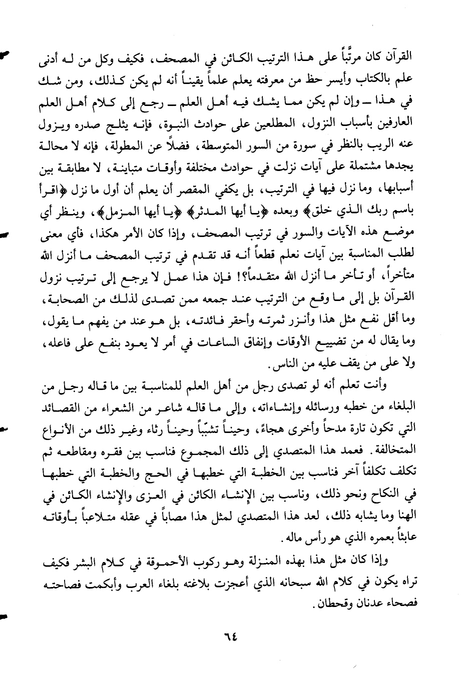 كما نقول إن القول بوجود المناسبات أمر يحتمه الاعتقاد بتنزيه كلام الله سبحانه وتعالى عن الفوضى والتناقض: