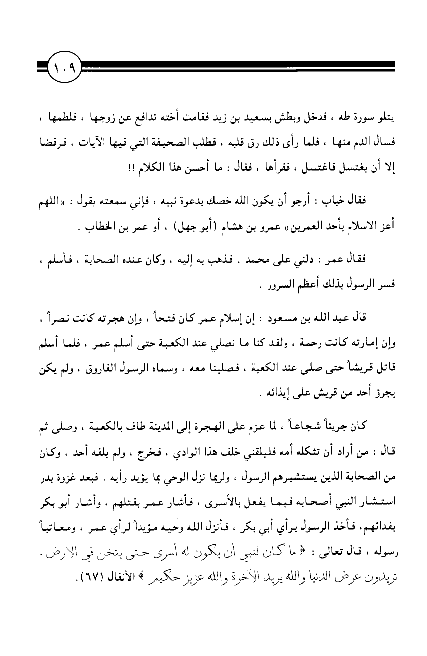 يتلو سورة طه، فدخل وبطش بسعيد بن زيد فقامت أخته تدافع عن زوجها، فلطمها، فسأل الدم منها، فلما رأى ذلك رق قلبه، فطلب الصحيفة التي فيها الآيات، فرفضا إلا أن يغتسل فاغتسل، فقرأها، فقال: ما أحسن هذا الكلام!!