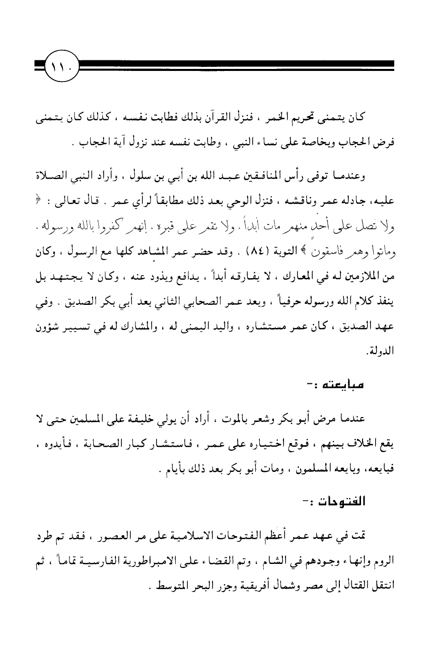 كان يتمنى تحريم الخمر، فنزل القرآن بذلك فطابت نفسه، كذلك كان يتمنى فرض الحجاب وبخاصة على نساء النبي، وطابت نفسه عند نزول آية الحجاب.