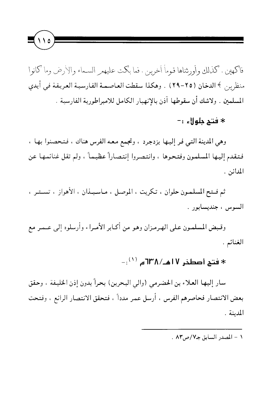 فَاكِهِينَ (27) كَذَلِكَ وَأَوْرَثْنَاهَا قَوْمًا آخَرِينَ (28) فَمَا بَكَتْ عَلَيْهِمُ السَّمَاءُ وَالْأَرْضُ وَمَا كَانُوا مُنْظَرِينَ} [الدخان: 25 - 29]. وهكذا سقطت العاصمة الفارسية العريقة في أيدي المسلمين. ولا شك أن سقوطها آذن بالإنهيار الكامل للإمبراطورية الفارسية.