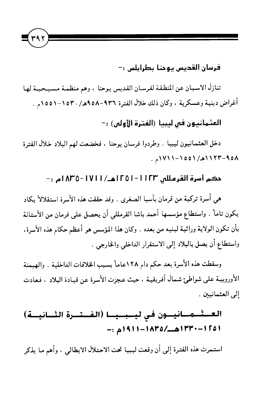 دخل العثمانيون ليبيا. وطردوا فرسان يوحنا، فخضعت لهم البلاد خلال الفترة 958 - 1123 هـ/1551 - 1711 م.
