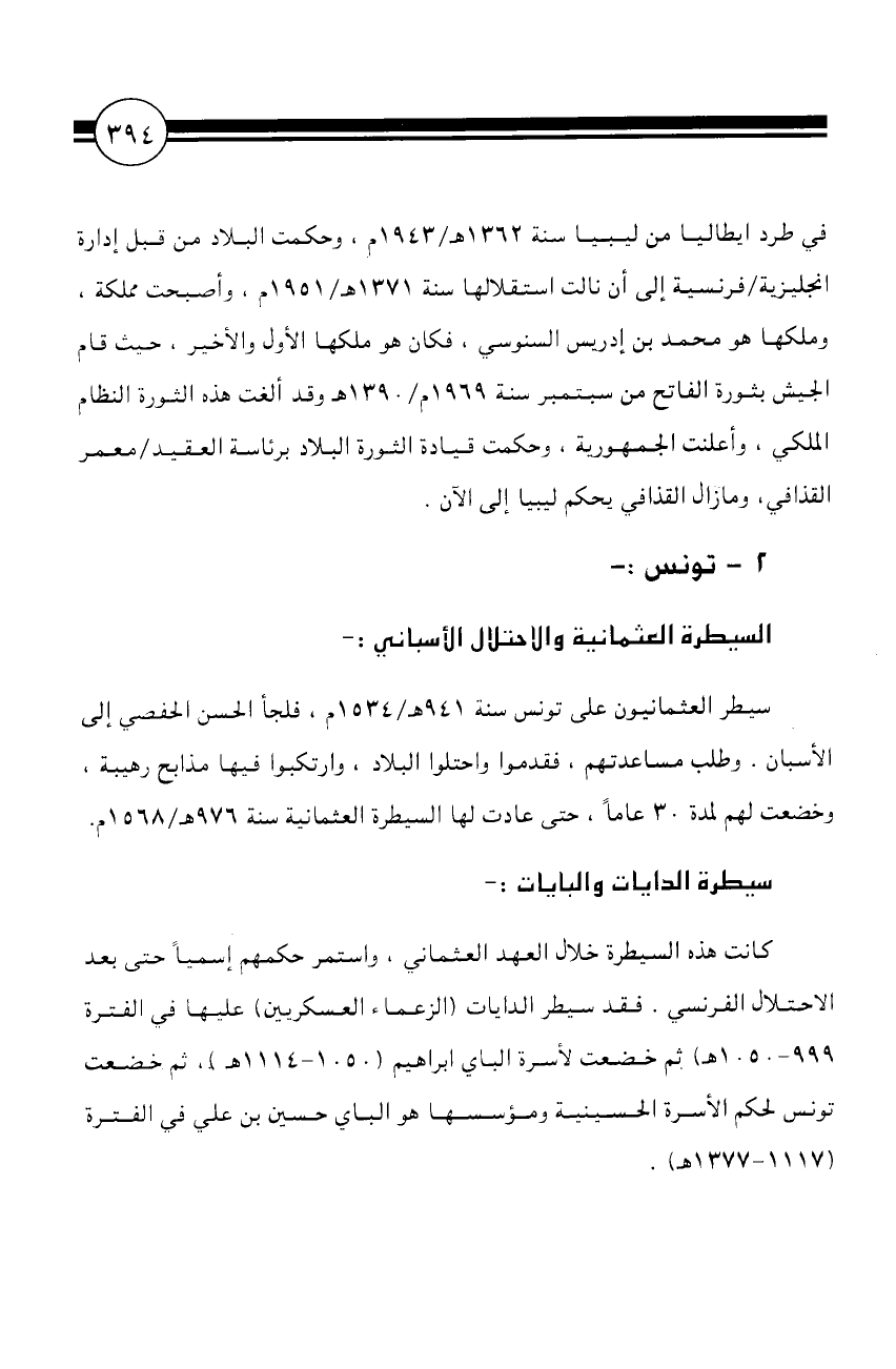 في طرد إيطاليا من ليبيا سنة 1362 هـ/1943 م، وحكمت البلاد من قبل إدارة انجليزية/فرنسية إلى أن نالت استقلالها سنة 1371 هـ/1951 م، وأصبحت مملكة، وملكها هو محمد بن إدريس السنوسي، فكان هو ملكها الأول والأخير، حيث قام الجيش بثورة الفاتح من سبتمبر سنة 1390 هـ/1969 هـ وقد ألغت هذه الثورة النظام الملكي، وأعلنت الجمهورية، وحكمت قيادة الثورة البلاد برئاسة العقيد/معمر القذافي، وما زال القذافي يحكم ليبيا إلى الآن.
