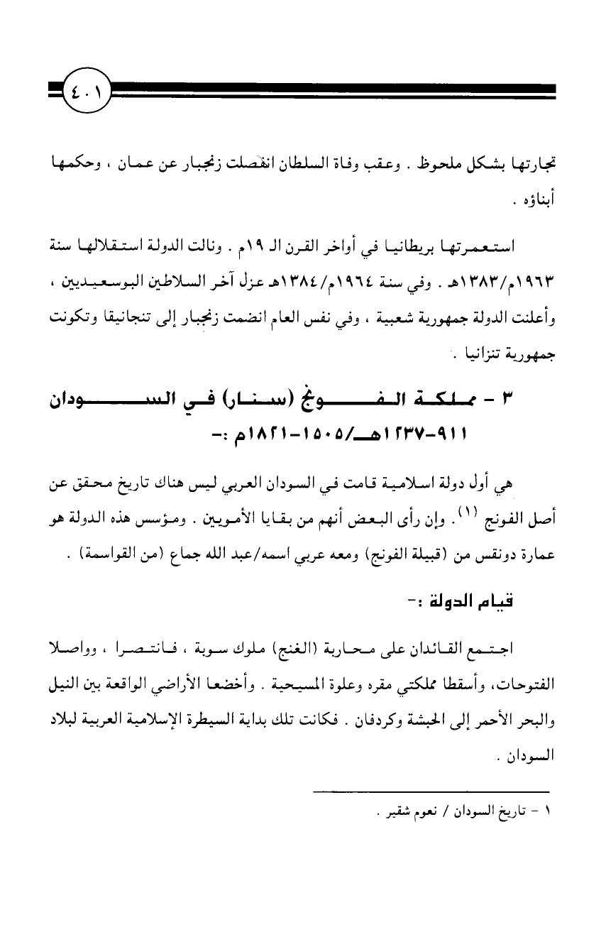 هي أول دولة إسلامية قامت في السودان العربي ليس هناك تاريخ محقق عن أصل الفونج (¬1). وإن رأى البعض أنهم من بقايا الأمويين. ومؤسس هذه الدولة هو عمارة دونقس من (قبيلة الفونج) ومعه عربي اسمه/عبد الله جماع (من القواسمة).