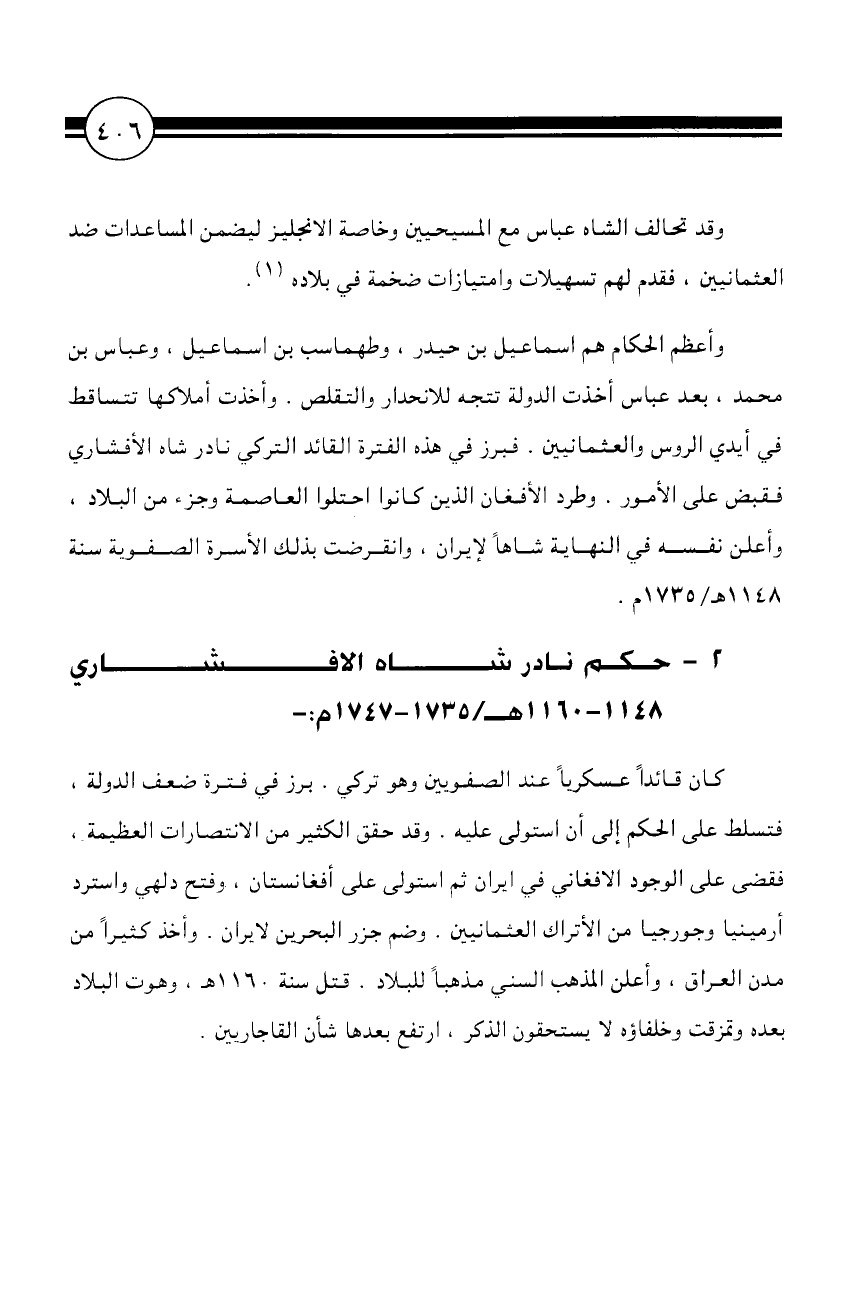 كان قائدًا عسكريًا عند الصفويين وهو تركي. برز في فترة ضعف الدولة، فتسلط على الحكم إلى أن استولى عليه. وقد حقق الكثير من الانتصارات العظيمة، فقضى على الوجود الأفغاني في إيران ثم استولى على أفغانستان، وفتح دلهي واسترد أرمينيا وجورجيا من الأتراك العثمانيين. وضم جزر البحرين لإيران. وأخذ كثيرًا من مدن العراق، وأعلن المذهب السني مذهبًا للبلاد. قتل سنة 1160 هـ، وهوت البلاد بعده وتمزقت وخلفاؤه لا يستحقون الذكر، ارتفع بعدها شأن القاجاريين.
