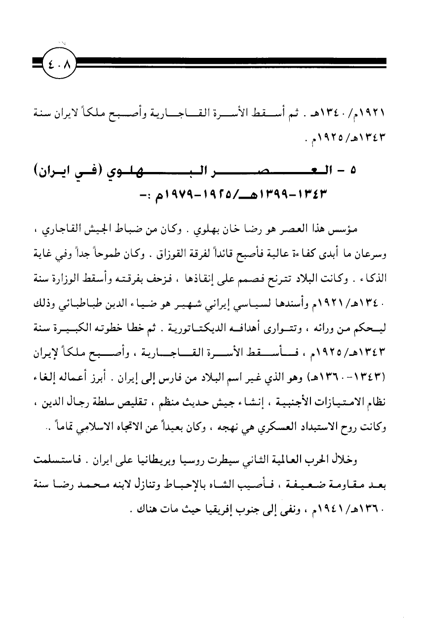 1340 هـ/1921 م. ثم أسقط الأسرة القاجارية وأصبح ملكًا لإيران سنة 1343 هـ/1925 م.