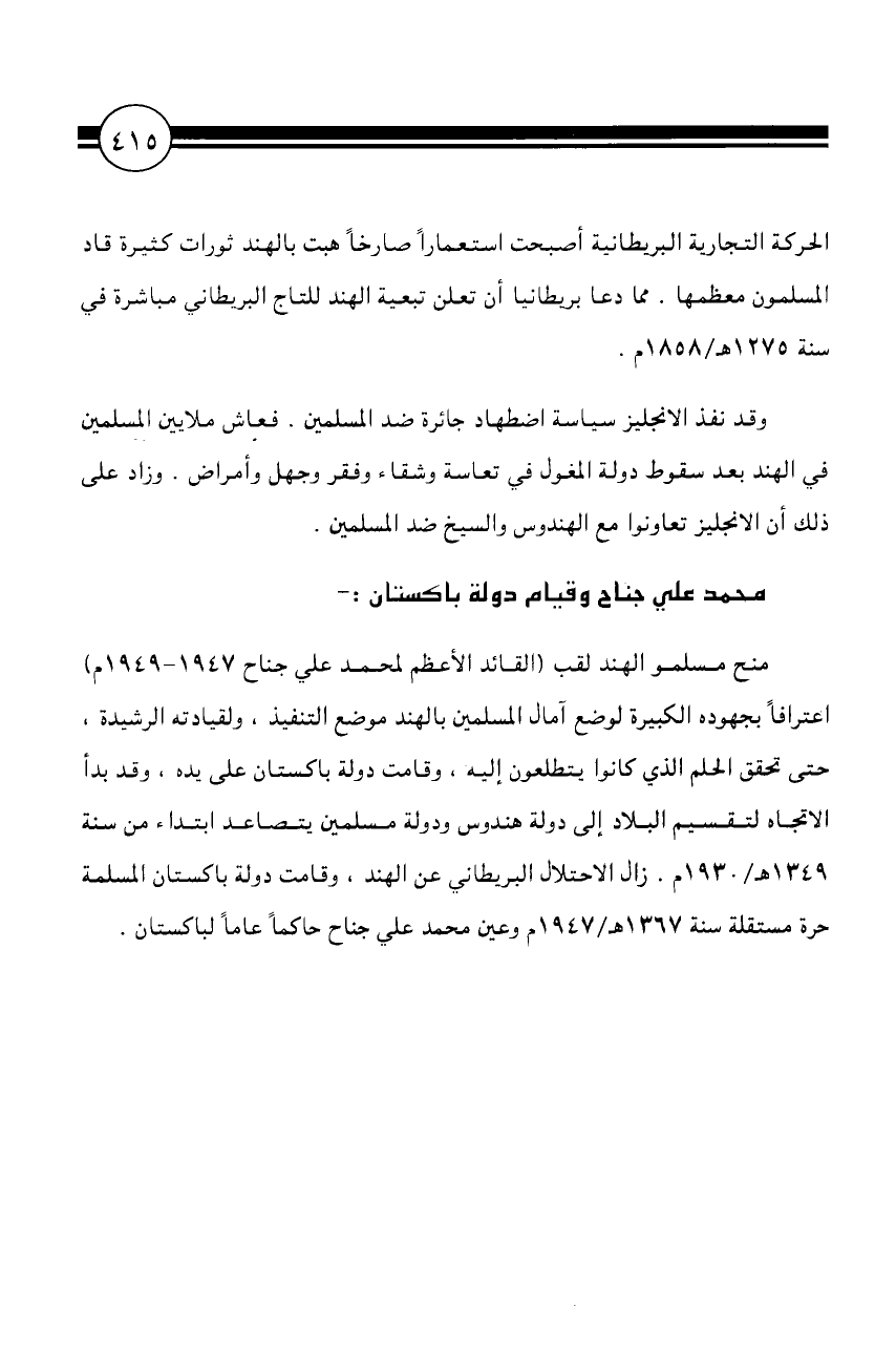 الحركة التجارية البريطانية أصبحت استعمارًا صارخًا هبت بالهند ثورات كثيرة قاد المسلمون معظمها. مما دعا بريطانيا أن تعلن تبعية الهند للتاج البريطاني مباشرة في سنة 1275 هـ/1858 م.