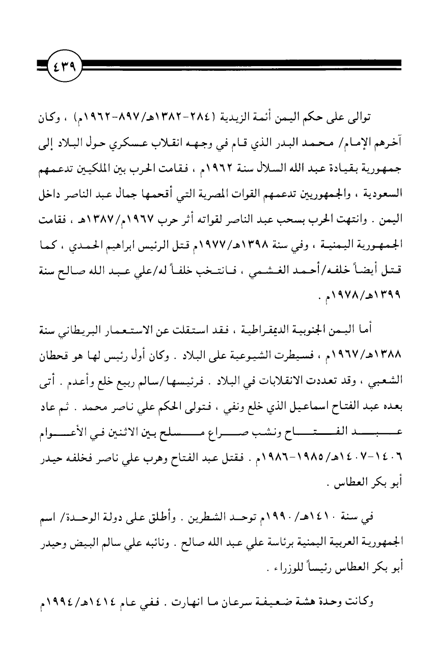 توالى على حكم اليمن أئمة الزيدية (284 - 1382 هـ/897 - 1962 م)، وكان آخرهم الإمام/محمد البدر الذي قام في وجهه انقلاب عسكري حول البلاد إلى جمهورية بقيادة عبد الله السلال سنة 1962 م، فقامت الحرب بين الملكيين تدعمهم السعودية، والجمهوريين تدعمهم القوات المصرية التي أقحمها جمال عبد الناصر داخل اليمن. وانتهت الحرب بسحب عبد الناصر لقواته أثر حرب 1387 هـ/1967 م، فقامت الجمهورية اليمنية، وفي سنة 1398 هـ/1977 م قتل الرئيس إبراهيم الحمدي، كما قتل أيضًا خلفه/أحمد الغشمي، فانتخب خلفًا له/علي عبد الله صالح سنة 1399 هـ/1978 م