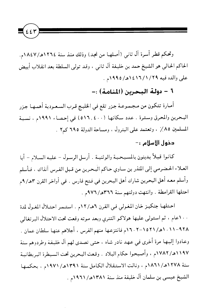 إمارة تتكون من مجموعة جزر تقع في الخليج قرب السعودية أهمها جزر البحرين والمحرق وسترة. عدد سكانها (516.400) في إحصاء 1991 م، نسبة المسلمين 85%، وتعتمد على البترول، ومساحة الدولة 695 كم 2.