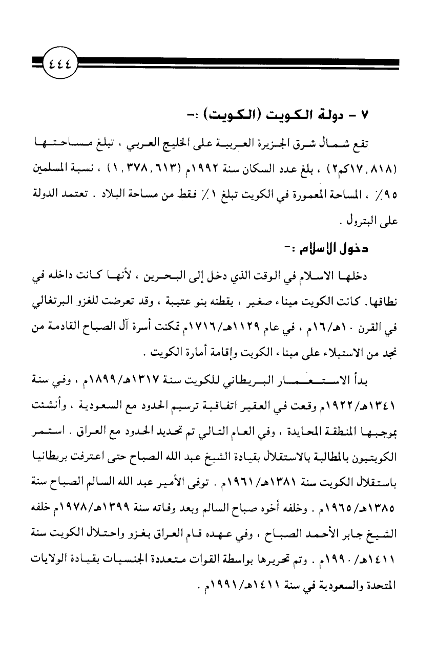 تقع شمال شرق الجزيرة العربية على الخليج العربي، تبلغ مساحتها (17.818 كم 2)، بلغ عدد السكان سنة 1992 م (1.378.613)، نسبة المسلمين 95%، المساحة المعمورة في الكويت تبلغ 1% فقط من مساحة البلاد. تعتمد الدولة على البترول.