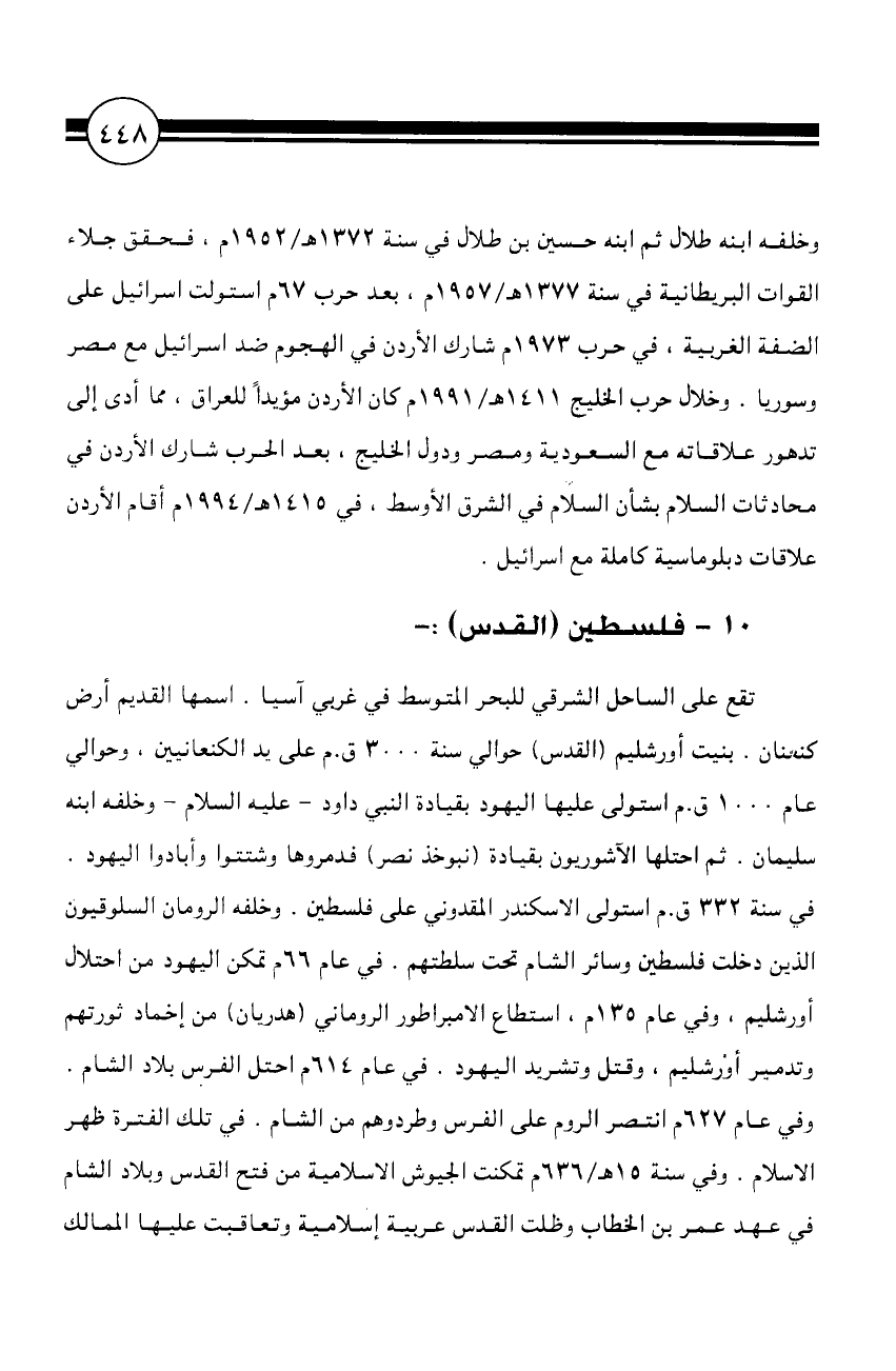 وخلفه ابنه طلال ثم ابنه حسين بن طلال في سنة 1372 هـ/1952 م، فحقق جلاء القوات البريطانية في سنة 1377 هـ/1957 م، بعد حرب 67 م استولت إسرائيل على الضفة الغربية، في حرب 1973 م شارك الأردن في الهجوم ضد إسرائيل مع مصر وسوريا. وخلال حرب الخليج 1411 هـ/1991 م كان الأردن مؤيدًا للعراق، مما أدى إلى تدهور علاقاته مع السعودية ومصر ودول الخليج، بعد الحرب شارك الأردن في محادثات السلام بشأن السلام في الشرق الأوسط، في 1415 هـ/1994 م أقام الأردن علاقات دبلوماسية كاملة مع إسرائيل.