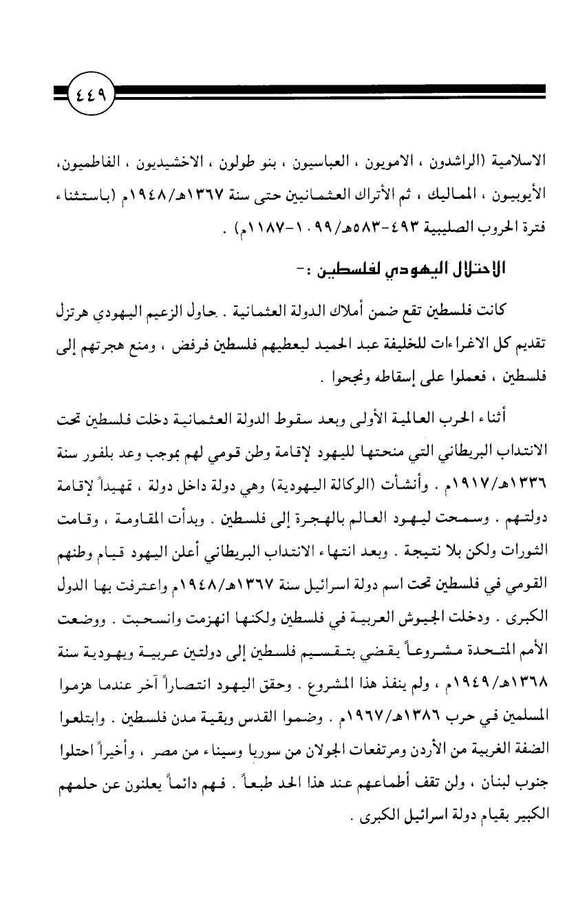 أثناء الحرب العالمية الأولى وبعد سقوط الدولة العثمانية دخلت فلسطين تحت الانتداب البريطاني التي منحتها لليهود لإقامة وطن قومي لهم بموجب وعد بلفور سنة 1336 هـ/1917 م. وأنشأت (الوكالة اليهودية) وهي دولة داخل دولة، تمهيدًا لإقامة دولتهم. وسمحت ليهود العالم بالهجرة إلى فلسطين. وبدأت المقاومة، وقامت الثورات ولكن بلا نتيجة. وبعد انتهاء الانتداب البريطاني أعلن اليهود قيام وطنهم القومي في فلسطين تحت اسم دولة إسرائيل سنة 1367 هـ/1948 م واعترفت بها الدول الكبرى. ودخلت الجيوش العربية في فلسطين ولكنها انهزمت وانسحبت. ووضعت الأمم المتحدة مشروعًا يقضي بتقسيم فلسطين إلى دولتين عربية ويهودية سنة 1368 هـ/1949 م، ولم ينفذ هذا المشروع. وحقق اليهود انتصارًا آخر عندما هزموا المسلمين في حرب 1386 هـ/1967 م. وضموا القدس وبقية مدن فلسطين. وابتلعوا الضفة الغريية من الأردن ومرتفعات الجولان من سوريا وسيناء من مصر، وأخيرًا احتلوا جنوب لبنان، ولن تقف أطماعهم عند هذا الحد طبعًا. فهم دائمًا يعلنون عن حلمهم الكبير بقيام دولة إسرائيل الكبرى.
