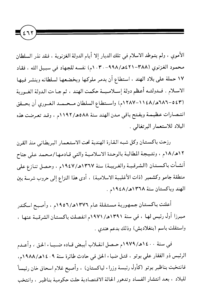 الأموي، ولم يتوطد الإسلام في تلك الديار إلا أيام الدولة الغزنوية، فقد نذر السلطان محمود الغزنوي (388 - 421 هـ/998 - 1030 م) نفسه للجهاد في سبيل الله، فقاد 17 حملة على بلاد الهند، استطاع أن يدمر ملوكها ويخضعها لسلطانه وينشر فيها الإسلام. فدولته أعظم دولة إسلامية حكمت الهند، ثم جاءت الدولة الغورية (543 - 686 هـ/1148 - 1287 م) واستطاع السلطان محمد الغوري أن يحقق انتصارات عظيمة ويفتح باقي مدن الهند سنة 588 هـ/1192 م، وقد تعرضت هذه البلاد للاستعمار البرتغالي.