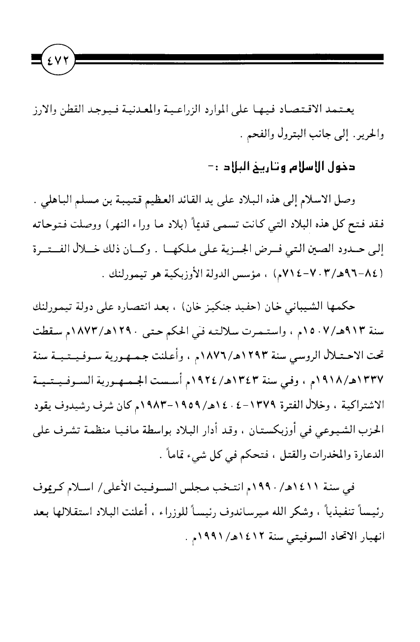 فقد فتح كل هذه البلاد التي كانت تسمى قديمًا (بلاد ما وراء النهر) ووصلت فتوحاته إلى حدود الصين التي فرض الجزية على ملكها. وكان ذلك خلال الفترة (84 - 96 هـ/703 - 714 م)، مؤسس الدولة الأوزبكية هو تيمور لنك.