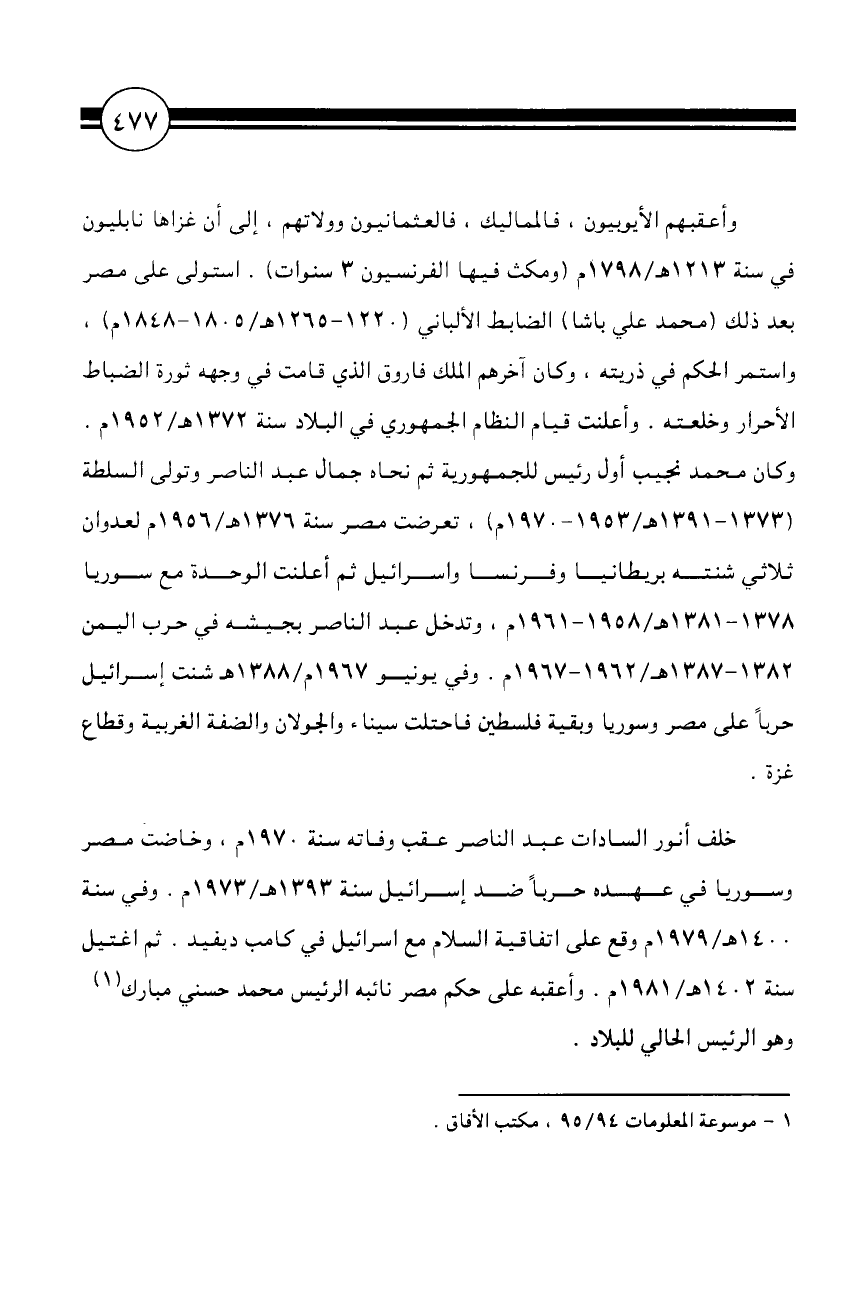 خلف أنور السادات عبد الناصر عقب وفاته سنة 1970 م، وخاضت مصر وسوريا في عهده حربًا ضد إسرائيل سنة 1393 هـ/1973 م. وفي سنة 1400 هـ/1979 م وقع على اتفاقية السلام مع إسرائيل في كامب ديفيد. ثم اغتيل سنة 1402 هـ/1981 م. وأعقبه على حكم مصر نائبه الرئيس محمد حسني مبارك (¬1) وهو الرئيس الحالي للبلاد.