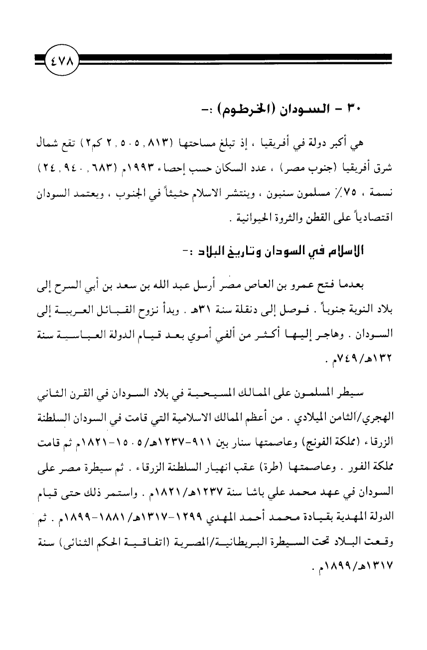 هي أكبر دولة في أفريقيا، إذ تبلغ مساحتها (2.505.813 كم 2) تقع شمال شرق أفريقيا (جنوب مصر)، عدد السكان حسب إحصاء 1993 م (24.940.683) نسمة، 75% مسلمون سنيون، وينتشر الإسلام حثيثًا في الجنوب، ويعتمد السودان اقتصاديًا على القطن والثروة الحيوانية.