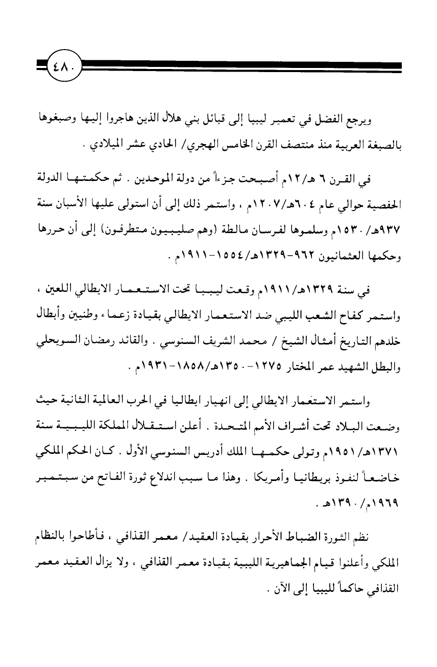 في سنة 1329 هـ/1911 م وقعت ليبيا تحت الاستعمار الإيطالي اللعين، واستمر كفاح الشعب الليبي ضد الاستعمار الإيطالي بقيادة زعماء وطنيين وأبطال خلدهم التاريخ أمثال الشيخ/محمد الشريف السنوسي. والقائد رمضان السويحلي والبطل الشهيد عمر المختار 1275 - 1350 هـ/1858 - 1931 م.
