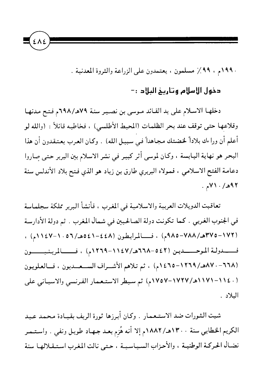 تعاقبت الدويلات العربية والإسلامية في المغرب، فأنشأ البربر مملكة سجلماسة في الجنوب الغربي. كما تكونت دولة الصالحيين في شمال الغرب. ثم دولة الأدارسة (172 - 375 هـ/788 - 985 م)، فالمرابطون (448 - 541 هـ/1056 - 1147 م) فدولة الموحدين (542 - 668 هـ/1147 - 1269 م)، فالمرينيون (668 - 870 هـ/1269 - 1465 م)، ثم تلاهم الأشراف السعديون، فالعلويون (1140 - 1171 هـ/1727 - 1757 م) ثم سيطر الاستعمار الفرنسي والأسباني على البلاد.