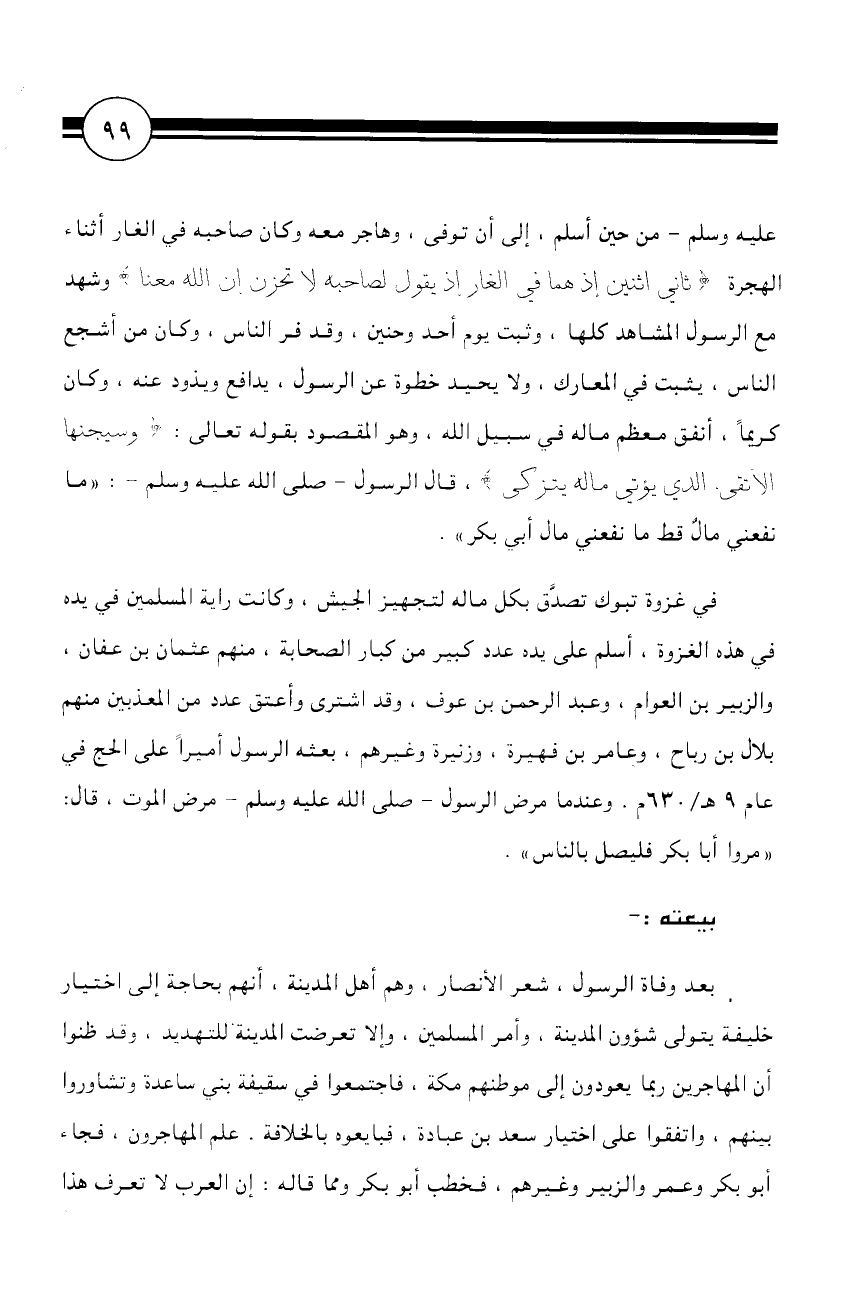 من حين أسلم إلى أن تُوفي، وهاجر معه وكان صاحبه في الغار أثناء الهجرة {ثَانِيَ اثْنَيْنِ إِذْ هُمَا فِي الْغَارِ إِذْ يَقُولُ لِصَاحِبِهِ لَا تَحْزَنْ إِنَّ اللَّهَ مَعَنَا} وشهد مع الرسول - صلى الله عليه وسلم - المشاهد كلها، وثبت يوم أحد وحنين، وقد فرَّ الناسُ، وكان من أشجع الناس، يثبت في المعارك، ولا يحيد خطوة عن الرسول - صلى الله عليه وسلم -، يدافع ويذود عنه، وكان كريماً، أنفق معظم ماله في سبيل الله، وهو المقصود بقوله تعالى {وَسَيُجَنَّبُهَا الْأَتْقَى (17) الَّذِي يُؤْتِي مَالَهُ يَتَزَكَّى} قال الرسول - صلى الله عليه وسلم - " ما نفعني مالٌ قط ما نفعني مال أبي بكر ".
