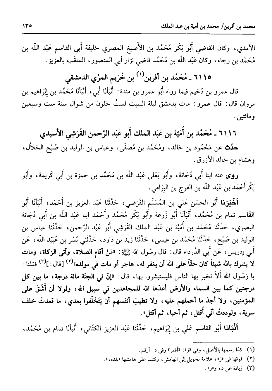6116 - محمد بن أمية بن عبد الملك أبو عبد الرحمن القرشي الأسيدي حدث عن محمود بن خالد ومحمد بن مصفى وعباس بن الوليد بن صبح الخلال وهشام بن خالد الأزرق روى عنه ابنا ابي دجانة أبو يعلى عبد الله بن محمد بن حمزة بن أبي كريمة وابو بكر أحمد بن عبد الله بن الفرج بن البرامي أخبرنا أبو الحسن علي بن المسلم الفرضي حدثنا عبد العزيز بن احمد أنبأنا أبو القاسم تمام بن محمد أنبأنا أبو زرعة وأبو بكر محمد وأحمد ابنا عبد الله بن ابي دجانة البصري حدثنا محمد بن أمية بن عبد الملك القرشي أبو عبد الرحمن حدثنا عباس بن الوليد بن صبح حدثنا محمد بن عيسى حدثنا زيد بن داود حدثني بسر بن عبيد الله عن أي إدريس عن أبي الدرداء قال قال رسول الله (صلى الله عليه وسلم) من أقام الصلاة وآتى الزكاة ومات لا يشرك بالله شيئا كان حقا على الله أن يغفر له هاجر أو مات في مولده (2) قال (3) فقلنا يا رسول الله ألا نخبر بها الناس فليستبشروا بها قال إن في الجنة مائة درجة ما بين كل درجتين كما بين السماء والأرض أعدها الله للمجاهدين في سبيل الله ولولا أن أشق على المؤمنين ولا أجد ما احملها عليه ولا تطيب أنفسهم أن يتخلفوا بعدي ما قعدت خلف سرية ولوددت أني أقتل ثم أحيا ثم أقتل أنبأنا أبو القاسم علي بن إبراهيم حدثنا عبد العزيز الكتاني أنبأنا تمام بن محمد