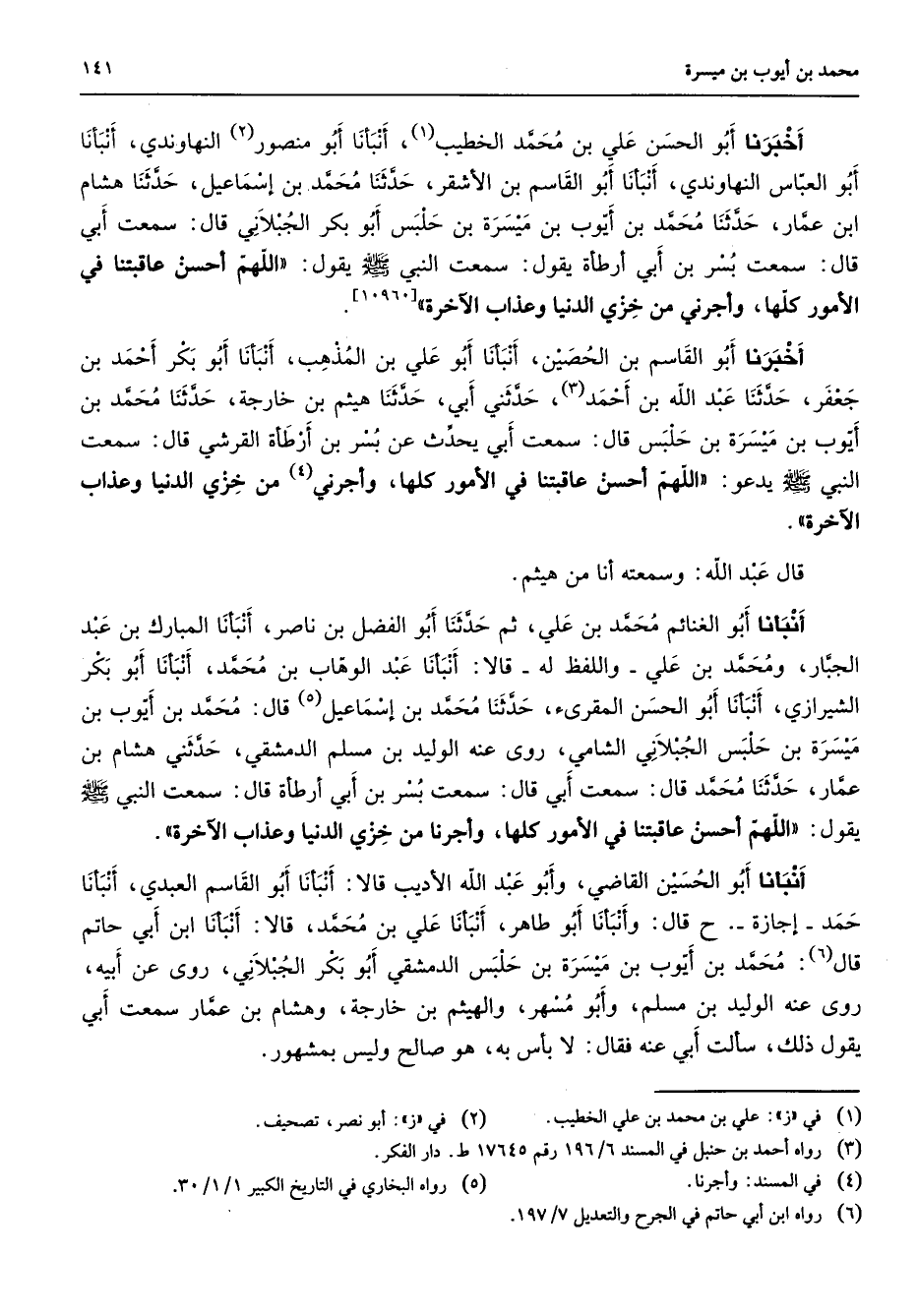[10960] أخبرنا أبو القاسم بن الحصين أنبأنا أبو علي بن المذهب أنبأنا أبو بكر أحمد بن جعفر حدثنا عبد الله بن احمد (3) حدثني أبي حدثنا هيثم بن خارجة حدثنا محمد بن أيوب بن ميسرة بن حلبس قال سمعت أبي يحدث عن بسر بن أرطأه القرشي قال سمعت النبي (صلى الله عليه وسلم) يدعو اللهم أحسن عاقبتنا في الأمور كلها وأجرني (4) من خزي الدنيا وعذاب الآخرة قال عبد الله وسمعته أنا من هيثم أنبأنا أبو الغنائم محمد بن علي ثم حدثنا أبو الفضل بن ناصر أنبأنا المبارك بن عبد الجبار ومحمد بن علي واللفظ له قالا أنبأنا عبد الوهاب بن محمد أنبأنا أبو بكر الشيرازي أنبأنا أبو الحسن المقرئ حدثنا محمد بن إسماعيل (5) قال محمد بن أيوب بن ميسرة بن حلبس الجبلاني الشامي روى عنه الوليد بن مسلم الدمشقي حدثني هشام بن عمار حدثنا محمد قال سمعت أبي قال سمعت بسر بن أبي أرطأه قال سمعت النبي (صلى الله عليه وسلم) يقول اللهم أحسن عاقبتنا في الأمور كلها وأجرنا من خزي الدنيا وعذاب الآخرة أنبأنا أبو الحسين القاضي وأبو عبد الله الأديب قال أنبأنا أبو القاسم العبدي أنبأنا حمد إجازة قال وأنبأنا أبو طاهر أنبأنا علي بن محمد قالا أنبأنا ابن ابي حاتم قال (6) محمد بن أيوب بن ميسرة بن حلبس الجبلاني الدمشقي أبو بكر الجبلاني روى عن أبيه روى عنه الوليد بن مسلم وأبو مسهر والهيثم بن خارجة وهشام بن عمار سمعت ابي يقول ذلك سألت أبي عنه فقال لا بأس به هو صالح وليس بمشهور