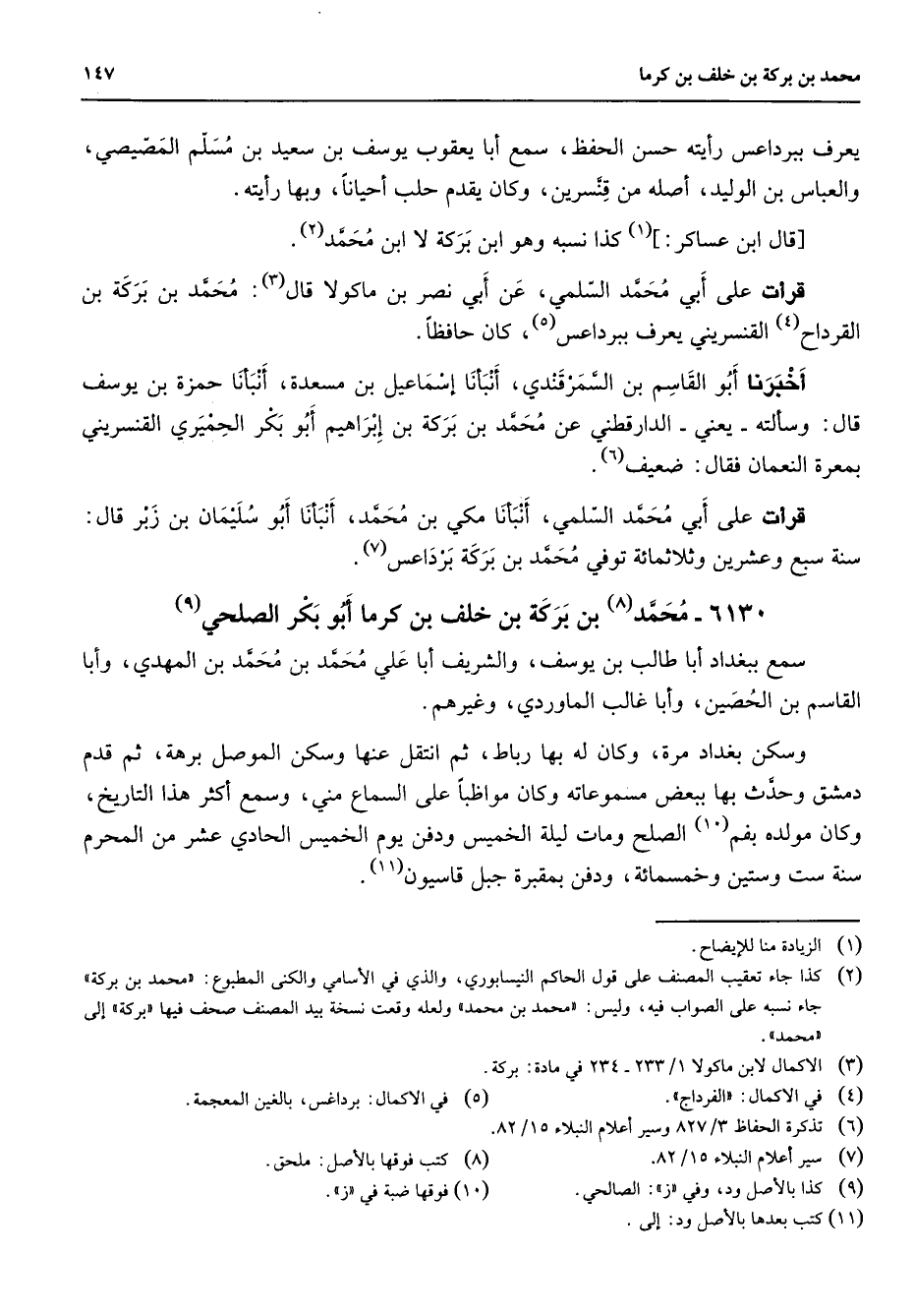 6130 - محمد (8) بن بركة بن خلف بن كرما أبو بكر الصلحي (9) سمع ببغداد أبا طالب بن يوسف والشريف أبا علي محمد بن محمد بن المهدي وأبا القاسم بن الحصين وأبا غالب الماوردي وغيرهم وسكن بغداد مرة وكان لها بها رباط ثم انتقل عنها وسكن الموصل برهة ثم قدم دمشق وحدث بها ببعض مسموعاته وكان مواظبا على السماع مني وسمع أكثر هذا التاريخ وكان مولده بفم (10) الصلح ومات ليلة الخميس ودفن يوم الخميس الحادي عشر من المحرم سنة ست وستين وخمسمائة ودفن بمقبرة جبل قاسيون (11)