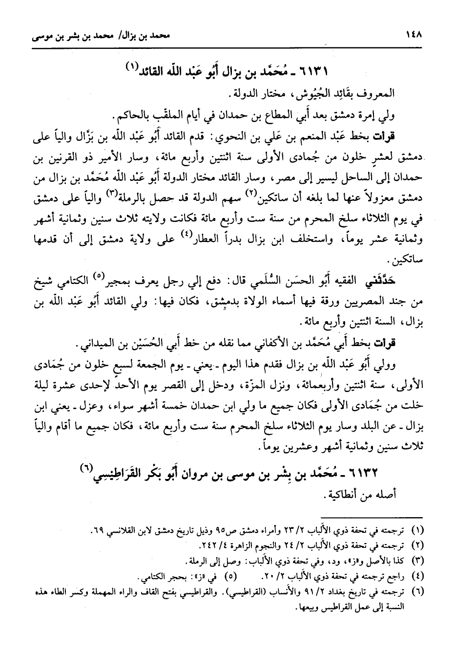 6131 - محمد بن بزال أبو عبد الله القائد (1) المعروف بقائد الجيوش مختار الدولة ولي إمرة دمشق بعد أبي المطاع بن حمدان في أيام الملقب بالحاكم قرأت بخط عبد المنعم بن علي بن النحوي قدم القائد أبو عبد الله بن بزال واليا على دمشق لعشر خلون من جمادى الأولى سنة اثنتين وأربع مائة وسار الأمير ذو القرنين بن حمدان إلى الساحل ليسير إلى مصر وسار القائد مختار الدولة أبو عبد الله محمد بن بزال من دمشق معزولا عنها لما بلغه أن ساتكين (2) سهم الدولة قد حصل بالرملة (3) واليا على دمشق في يوم الثلاثاء سلخ المحرم من سنة ست وأربع مائة فكانت ولايته ثلاث سنين وثمانية أشهر وثمانية عشر يوما واستخلف ابن بزال بدرا العطار (4) على ولاية دمشق إلى أن قدمها ساتكين حدثني الفقية أبو الحسن السلمي قال دفع إلي رجل يعرف بمجير (5) الكتامي شيخ من جند المصريين ورقة فيها أسماء الولاة بدمشق فكان فيها ولي القائد أبو عبد الله بن بزال السنة اثنتين وأربع مائة قرأت بخط أبي محمد بن الأكفاني مما نقله من خط أبي الحسين بن الميداني وولي أبو عبد الله بن بزال فقدم هذا اليوم يعني يوم الجمعة لسبع خلون من جمادى الأولى سنة أثنتين وأربعمائة ونزل المزة ودخل إلى القصر يوم الأحد لإحدى عشرة ليلة خلف من جمادى الأولى فكان جميع ما ولي ابن حمدان خمسة أشهر سواء وعزل يعني ابن بزال عن البلد وسار يوم الثلاثاء سلخ المحرم سنة ست وأربع مائة فكان جميع ما أقام واليا ثلاث سنين وثمانية أشهر وعشرين يوما