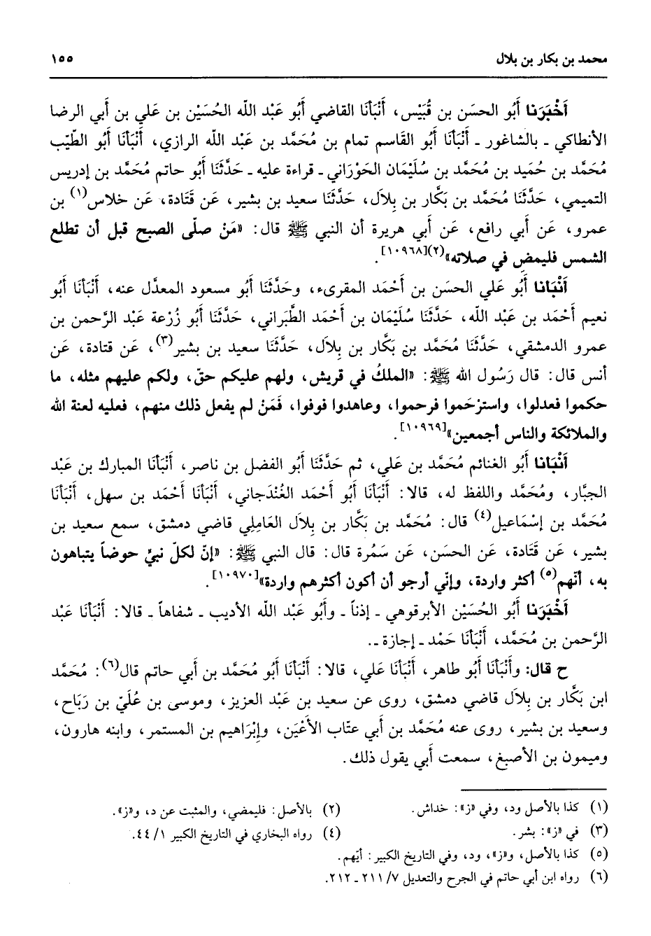 أخبرنا أبو الحسن بن قبيس أنبأنا القاضي أبو عبد الله الحسين بن علي بن أبي الرضا الأنطاكي بالشاغور أنبأنا أبو القاسم تمام بن محمد بن عبد الله الرازي أنبأنا أبو الطيب محمد بن حميد بن محمد بن سليمان الحوراني قراءة عليه حدثنا أبو حاتم محمد بن إدريس التميمي حدثنا محمد بن بكار بن بلال حدثنا سعيد بن بشير عن قتادة عن خلاس (1) بن عمرو عن أبي رافع عن أبي هريرة أن النبي (صلى الله عليه وسلم) قال من صلى الصبح قبل أن تطلع الشمس فليمض في صلاته (2)