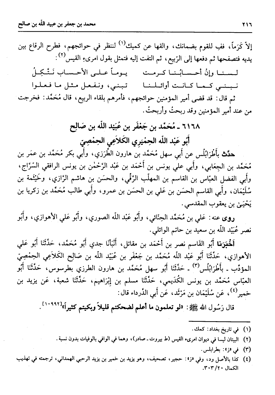 6168 - محمد بن جعفر بن عبيد الله بن صالح أبو عبد الله الحميري الكلاعي الحمصي حدث باطرابلس عن أبي سهل محمد بن هارون الطرزي وأبي بكر محمد بن عمر بن محمد بن الجعابي وأبي علي يونس بن أحمد بن عبد الرحمن بن يونس الرافقي السراج وأبي الفضل العباس بن القاسم بن المهلب الرقي والحسن بن هاشم الرازي وخيثمة بن سليمان وأبي القاسم الحسن بن علي بن الحسن بن عمرو وابي طالب محمد بن زكريا بن يحيى بن يعقوب المقدسي روى عنه علي بن محمد الحنائي وأبو عبد الله الصوري وأبو علي الأهوازي وأبو نصر عبيد الله بن سعيد بن حاتم الوائلي أخبرنا أبو القاسم نصر بن أحمد بن مقاتل أنبأنا جدي أبو محمد حدثنا أبو علي الأهوازي حدثنا أبو عبد الله محمد بن جعفر بن عبيد الله بن صالح الكلاعي الحمصي المؤدب بأطرابلس (3) حدثنا أبو سهل محمد بن هارون الطرزي بطرسوس حدثنا أبو العباس محمد بن يونس الكديمي حدثنا مسلم بن إبراهيم حدثنا شعبة عن يزيد بن خمير (4) عن سليمان بن مرثد عن ابي الدرداء قال قال رسول الله (صلى الله عليه وسلم) لو تعلمون ما أعلم لضحكتم قليلا وبكيتم كثيرا