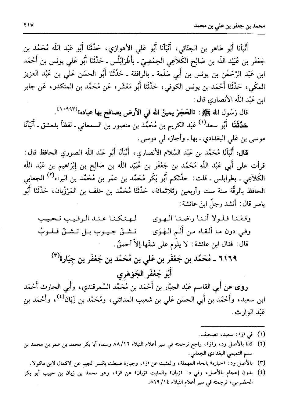 أنبأنا أبو طاهر بن الحنائي أنبأنا أبو علي الأهوازي حدثنا أبو عبد الله محمد بن جعفر بن عبيد الله بن صالح الكلاعي الحمصي بأطرابلس حدثنا أبو علي يونس بن أحمد ابن عبد الرحمن بن يونس بن أبي سلمة بالرافقة حدثنا أبو الحسن علي بن عبد العزيز المكي حدثنا أحمد بن يونس الكوفي حدثنا أبو معشر عن محمد بن المنكدر عن جابر ابن عبد الله الأنصاري قال قال رسول (صلى الله عليه وسلم) الحجر يمين الله في الأرض يصافح بها عبادة