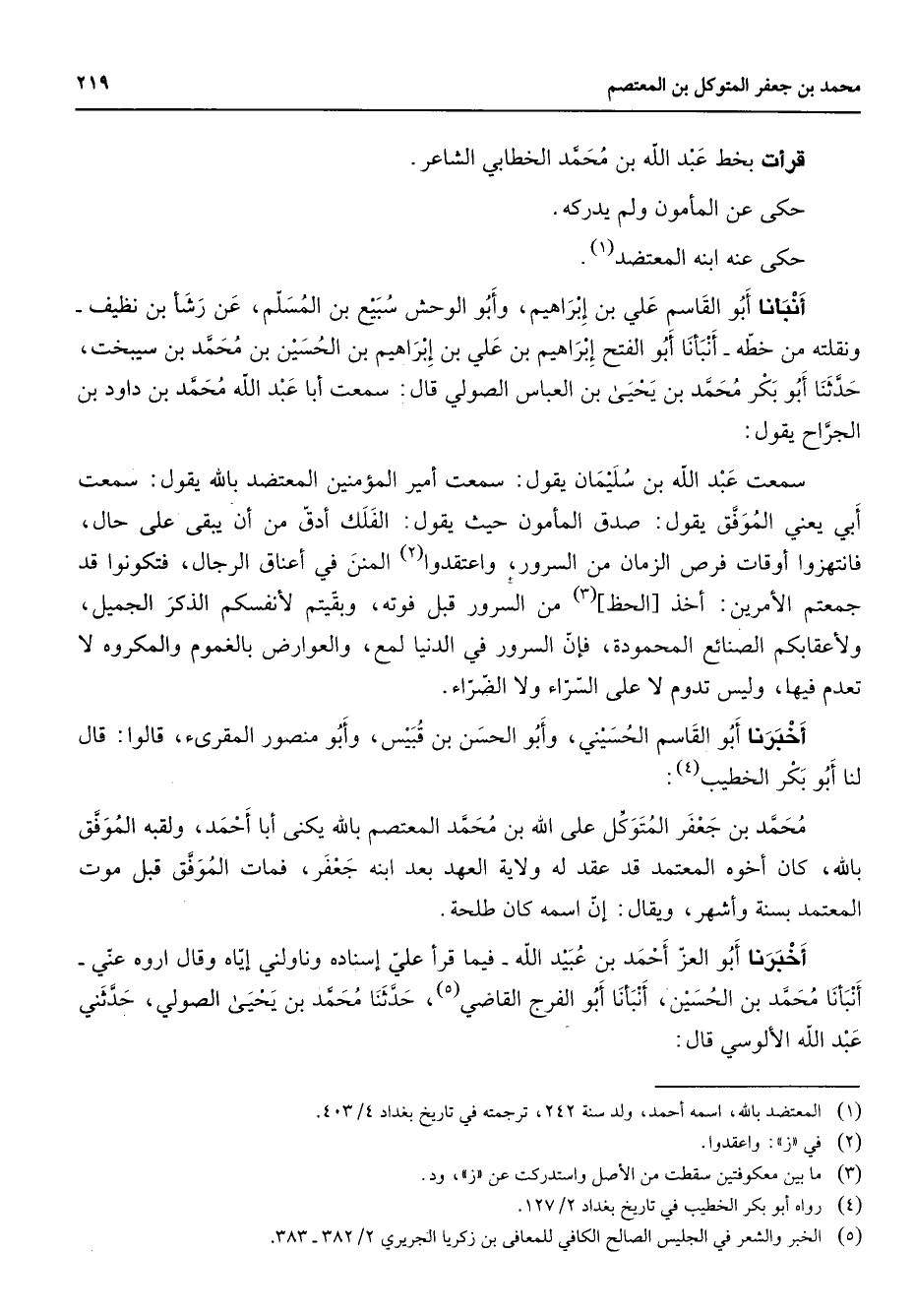 قرأت بخط عبد الله بن محمد الخطابي الشاعر حكى عن المأمون ولم يدركه حكى عنه ابنه المعتضد (1) أنبأنا أبو القاسم علي بن إبراهيم وأبو الوحش سبيع بن المسلم عن رشأ بن نظيف ونقلته من خطه أنبأنا أبو الفتح إبراهيم بن علي بن إبراهيم بن الحسين بن محمد بن سيبخت حدثنا أبو بكر محمد بن يحيى بن العباس الصولي قال سمعت أبا عبد الله محمد بن داود بن الجراح يقول سمعت عبد الله بن سليمان يقول سمعت أمير المؤمنين المعتضد بالله يقول سمعت ابي يعني الموفق يقول صدق المأمون حيث يقول الفلك أدق من أن يبقى على حال فتانهزوا أوقات فرص الزمان من السرور واعتقدوا (2) المنن في أعناق الرجال فتكونوا قد جمعتم الأمرين أخذ الحظ (3) من السرور قبل فوته وبقيتم لأنفسكم الذكر الجميل ولأعقابكم الصنائع المحمودة فإن السرور في الدنيا لمع والعوارض بالغموم والمكروه لا تعدم فيها وليس تدوم لا على السراء ولا الضراء أخبرنا أبو القاسم الحسيني وابو الحسن بن قبيس وأبو منصور المقرئ قالوا قال لنا أبو بكر الخطيب (4) محمد بن جعفر المتوكل على الله بن محمد المعتصم بالله يكنى أبا أحمد ولقبه الموفق بالله كان اخوه المعتمد قد عقد له ولاية العهد بعد ابنه جعفر فمات الموفق قبل موت المعتمد بسنة وأشهر ويقال إن أسمه كان طلحة أخبرنا أبو العز أحمد بن عبيد الله فيما قرأ علي إسناده وناولني اياه وقال اروه عني أنبأنا محمد بن الحسين أنبأنا أبو الفرج القاضي (5) حدثنا محمد بن يحيى الصولي حدثني عبد الله الألوسي قال