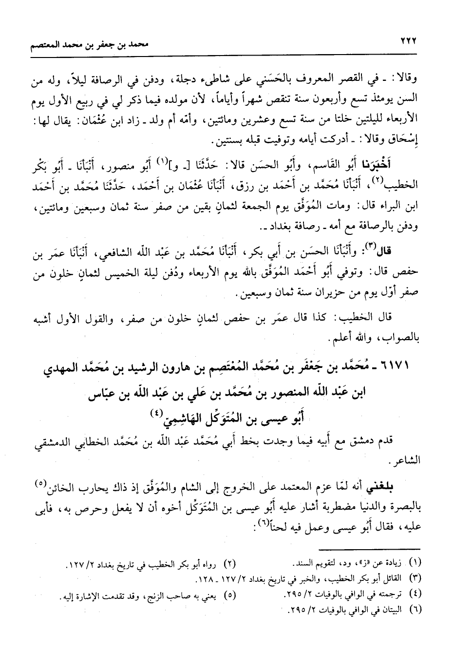 6171 - محمد بن جعفر بن محمد بن المعتصم بن هارون الرشيد بن محمد المهدي أبن عبد الله المنصور بن محمد بن علي بن عبد الله بن عباس أبو عيسى بن المتوكل الهاشمي (4) قدم دمشق مع أبيه فيما وحدت بخط ابي محمد عبد الله بن محمد الخطابي الدمشقي الشاعر بلغني أنه لما عزم المعتمد على الخروج إلى الشام والموفق إذ ذاك يحارب الخائن (5) بالبصرة والدنيا مضطربة أشار عليه أبو عيسى بن المتوكل اخوه أن لا يفعل وحرص به فأبى عليه فقال أبو عيسى وعمل فيه لحنا (6)